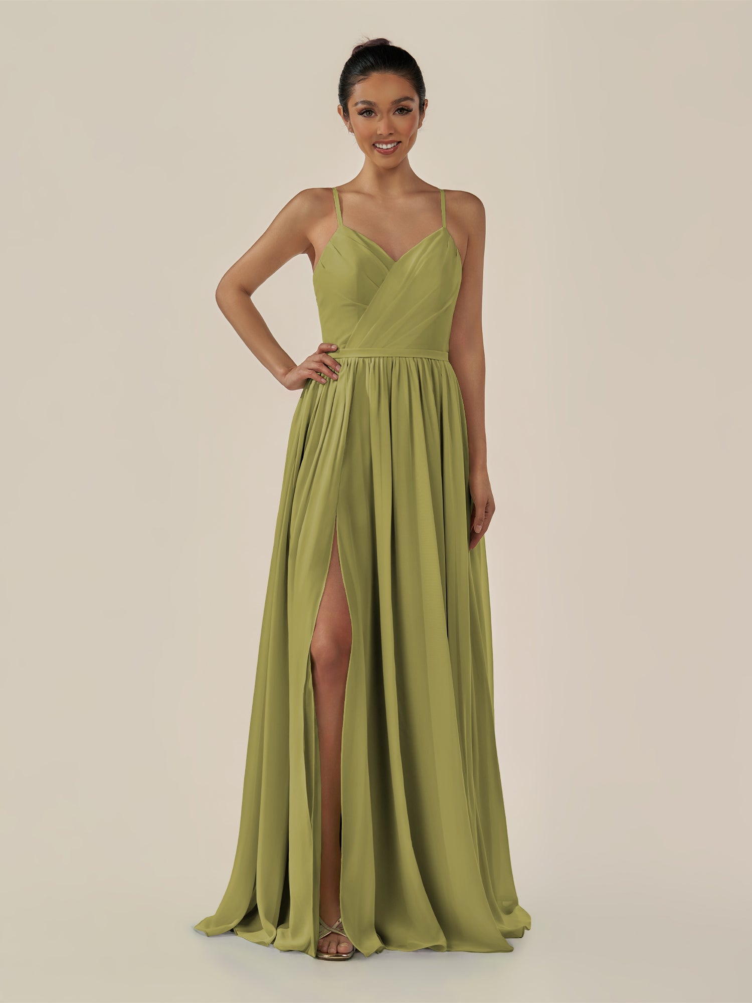 Irissa | Moss Green - A Line Chiffon V Neck Pleated Long Bridesmaid Dress with Slit