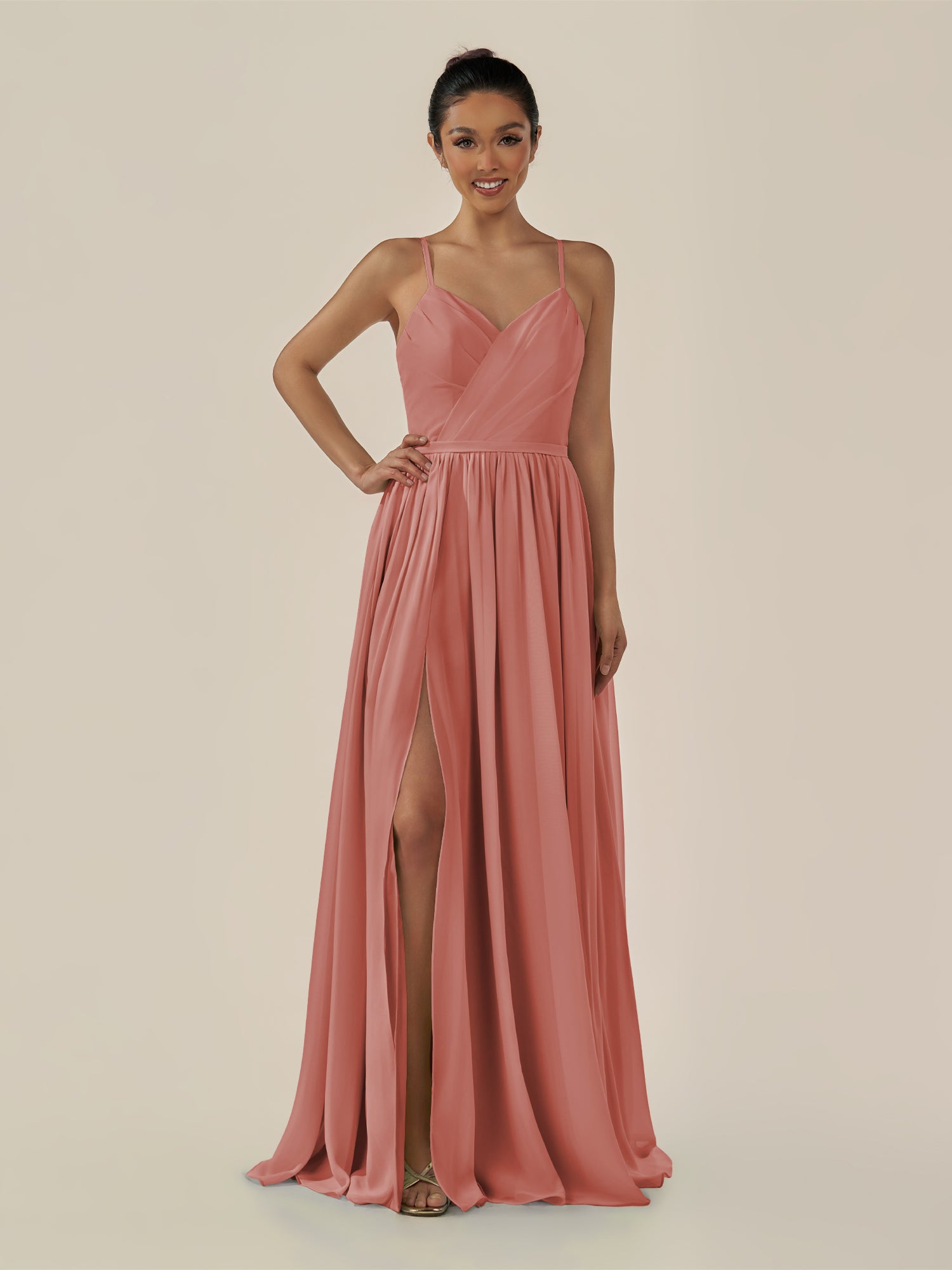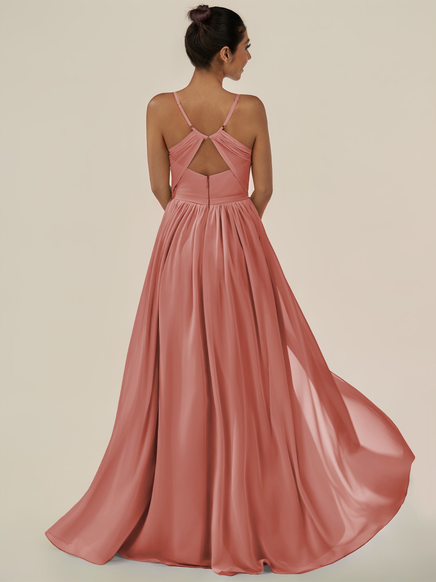 Irissa embodies graceful sophistication and modern charm. Crafted from soft chiffon, she features a flattering V-neckline and a sleeveless bodice that highlights the shoulders elegantly. Her floor-length A-line skirt flows effortlessly, enhanced by subtle pleats and a tasteful side slit for ease of movement. Finished with a smooth zipper back, Irissa is perfect for bridesmaids seeking a timeless and airy silhouette.