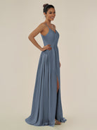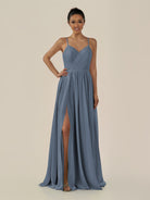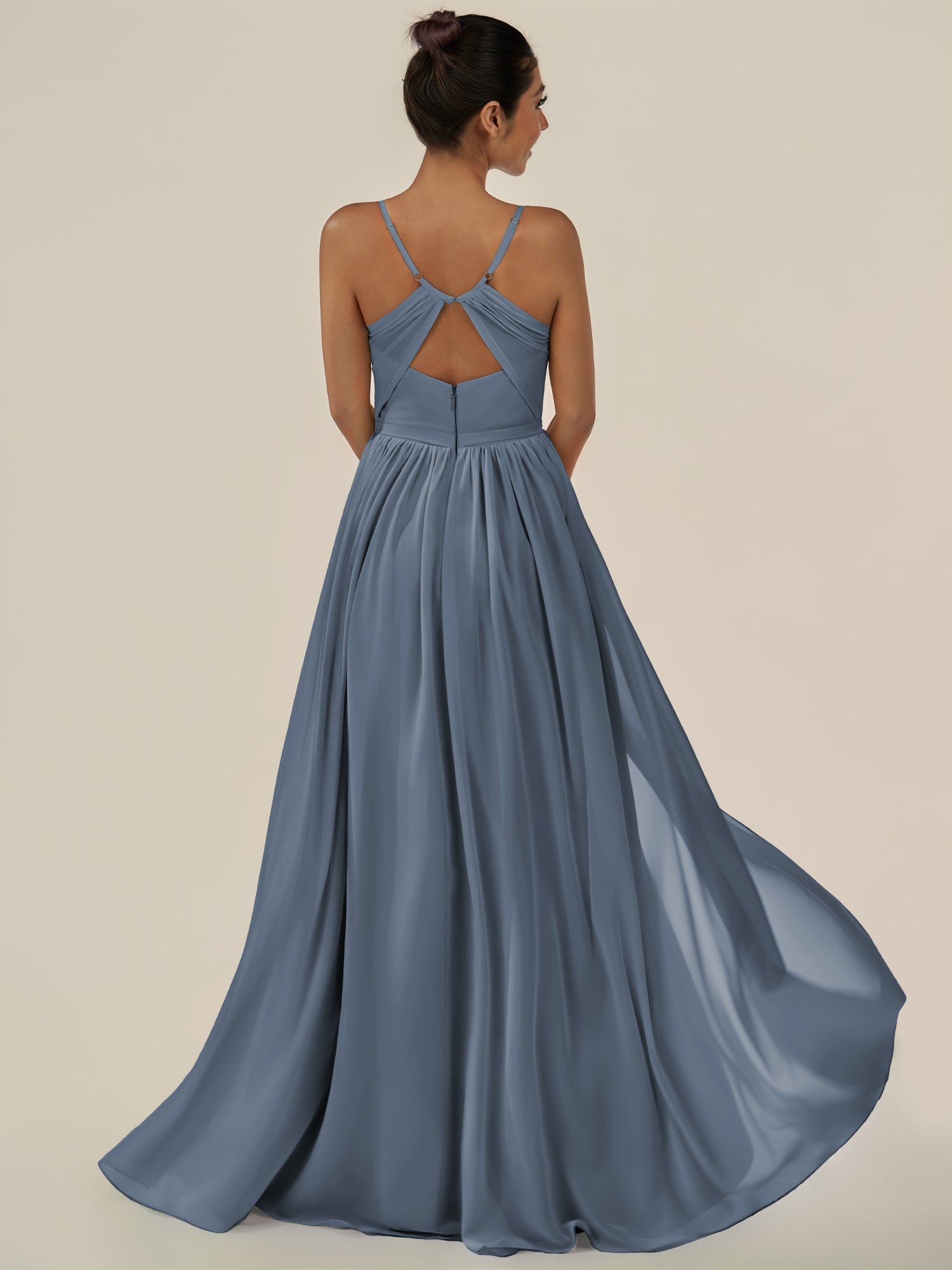 Irissa | Neptune - A Line Chiffon V Neck Pleated Long Bridesmaid Dress with Slit