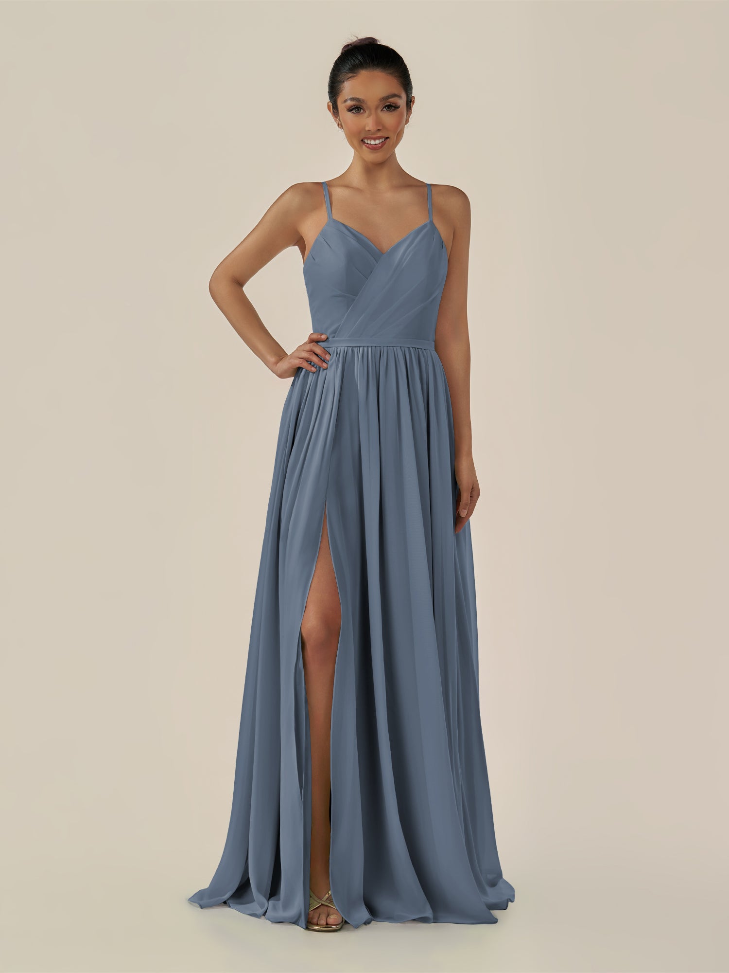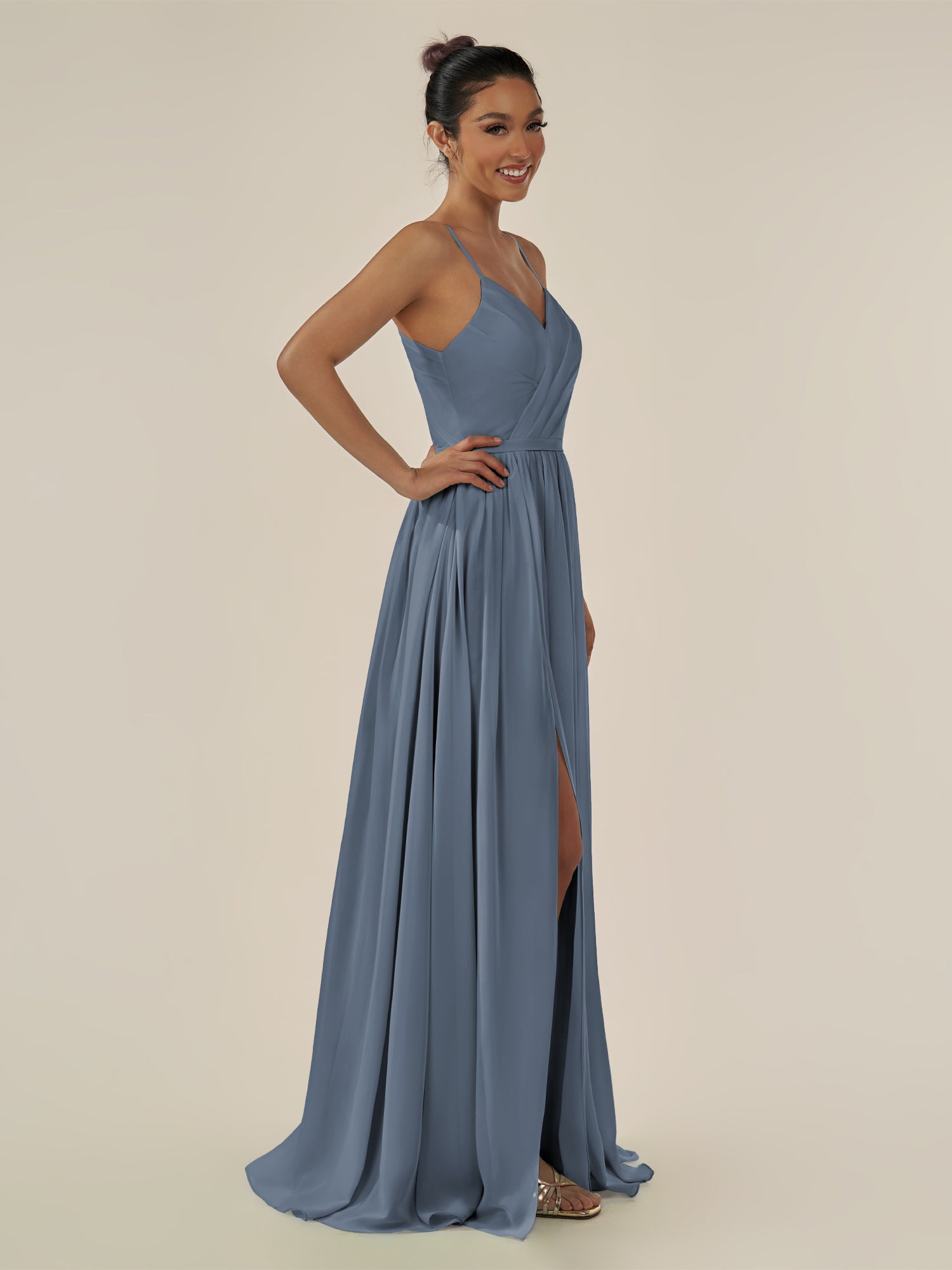 Irissa embodies graceful sophistication and modern charm. Crafted from soft chiffon, she features a flattering V-neckline and a sleeveless bodice that highlights the shoulders elegantly. Her floor-length A-line skirt flows effortlessly, enhanced by subtle pleats and a tasteful side slit for ease of movement. Finished with a smooth zipper back, Irissa is perfect for bridesmaids seeking a timeless and airy silhouette.