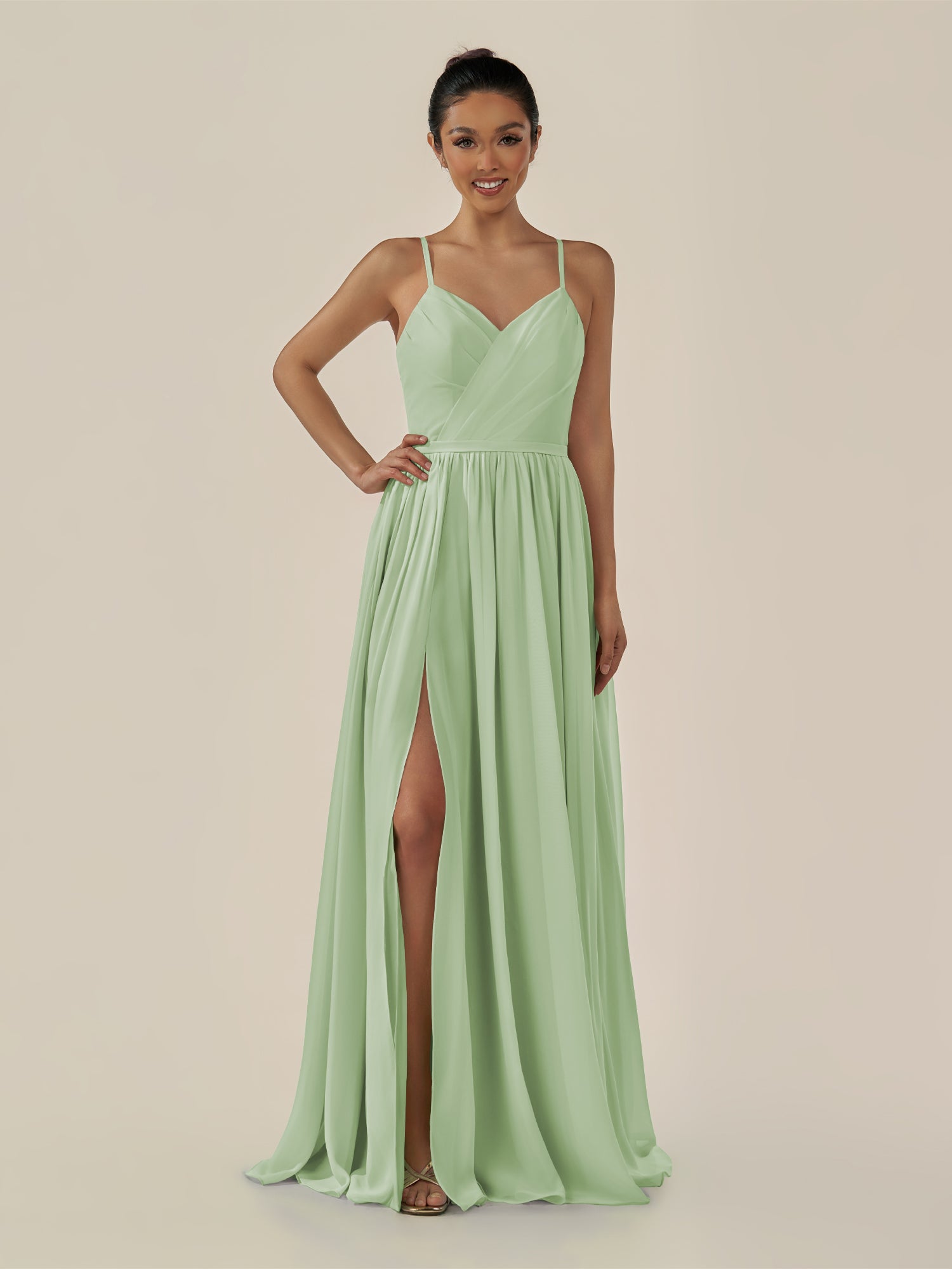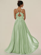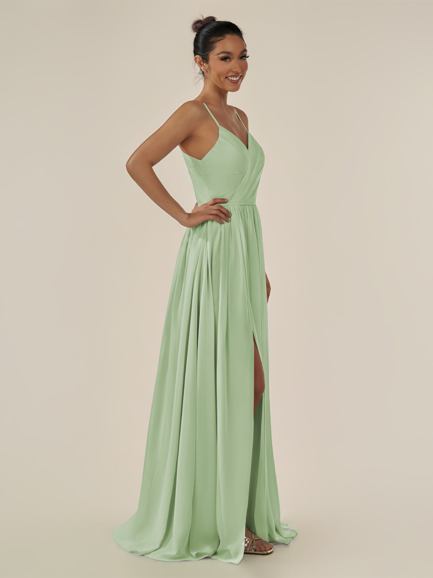 Irissa | Sage - A Line Chiffon V Neck Pleated Long Bridesmaid Dress with Slit