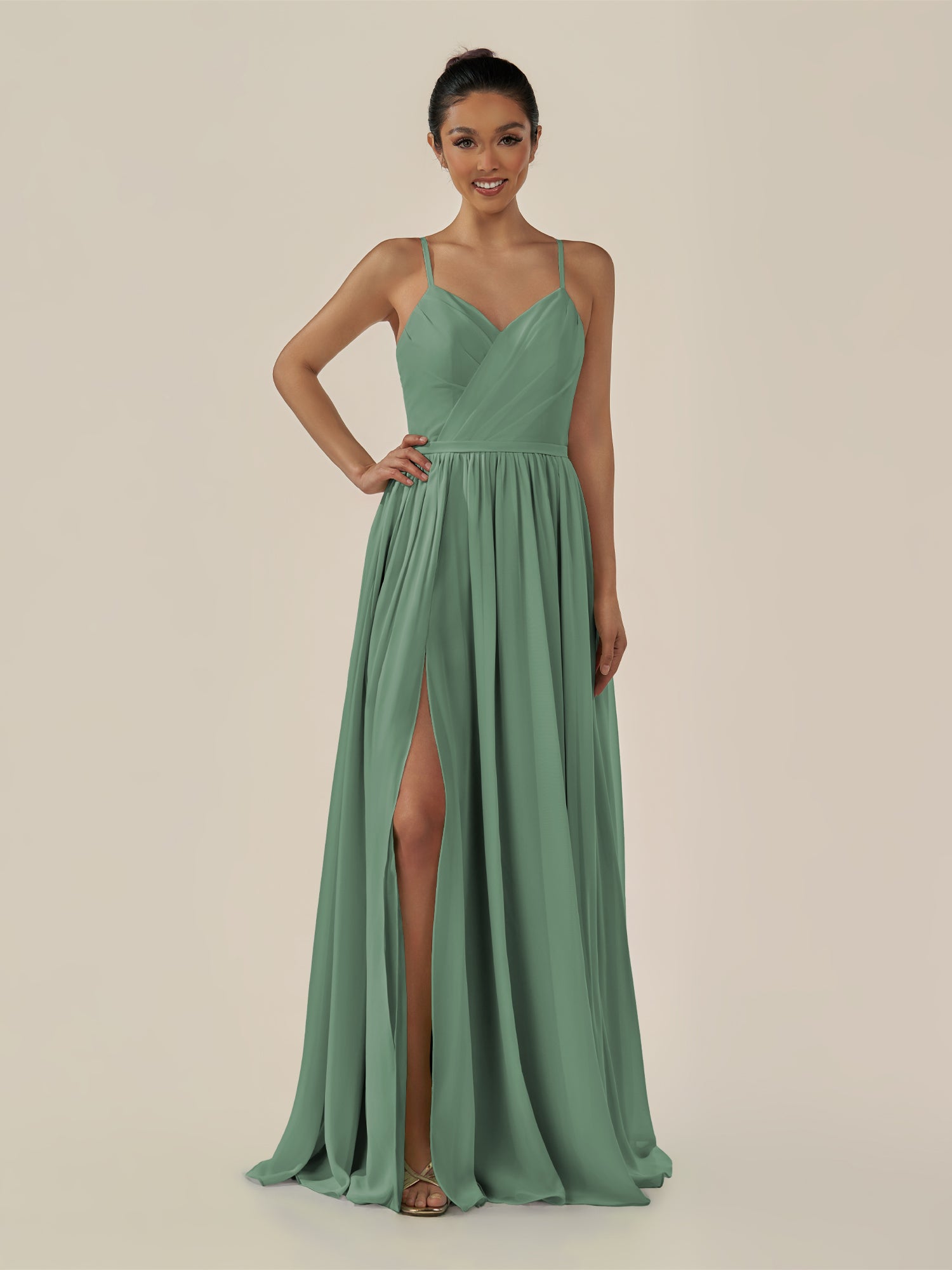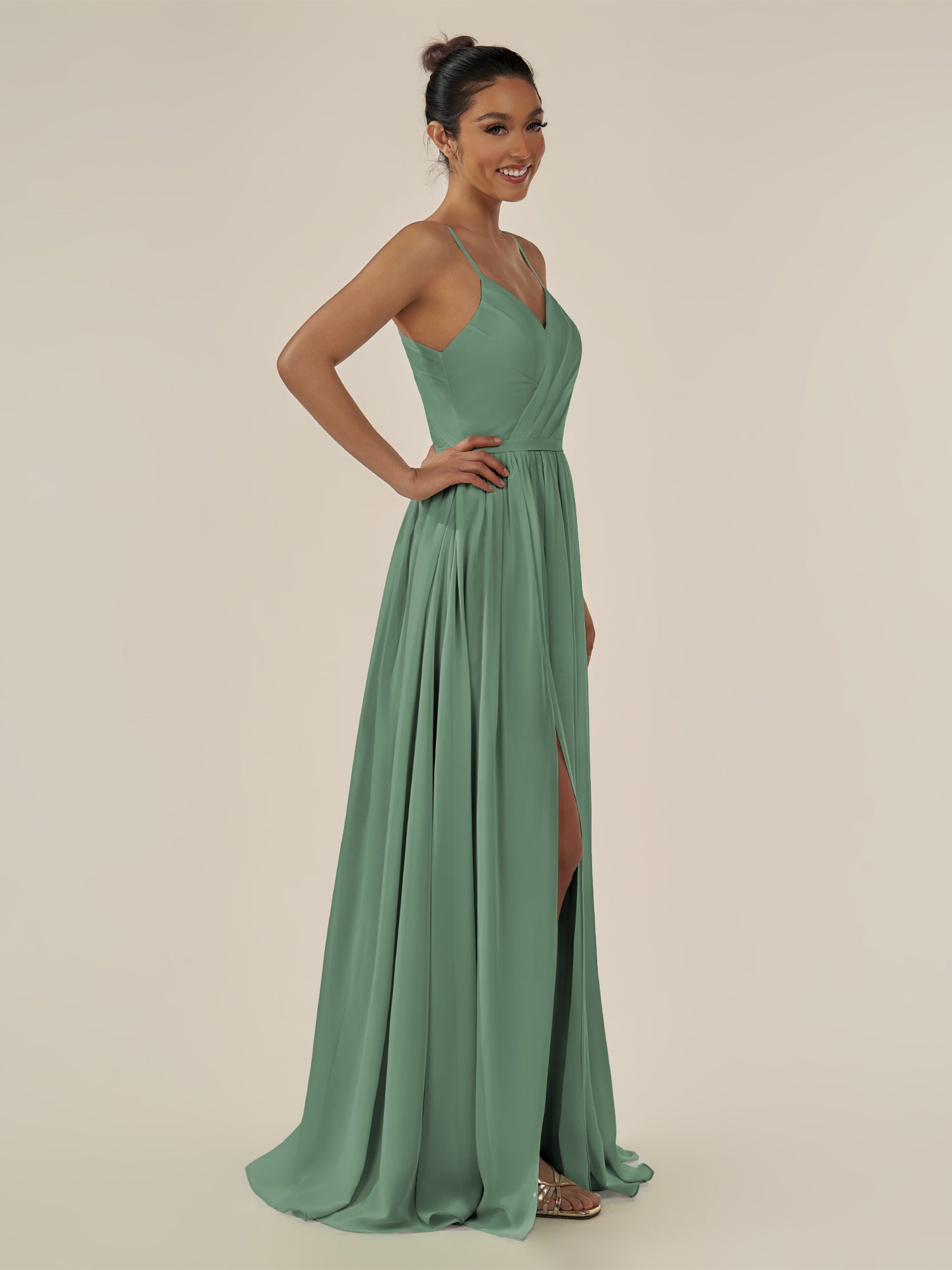 Irissa | Sea Glass - A Line Chiffon V Neck Pleated Long Bridesmaid Dress with Slit