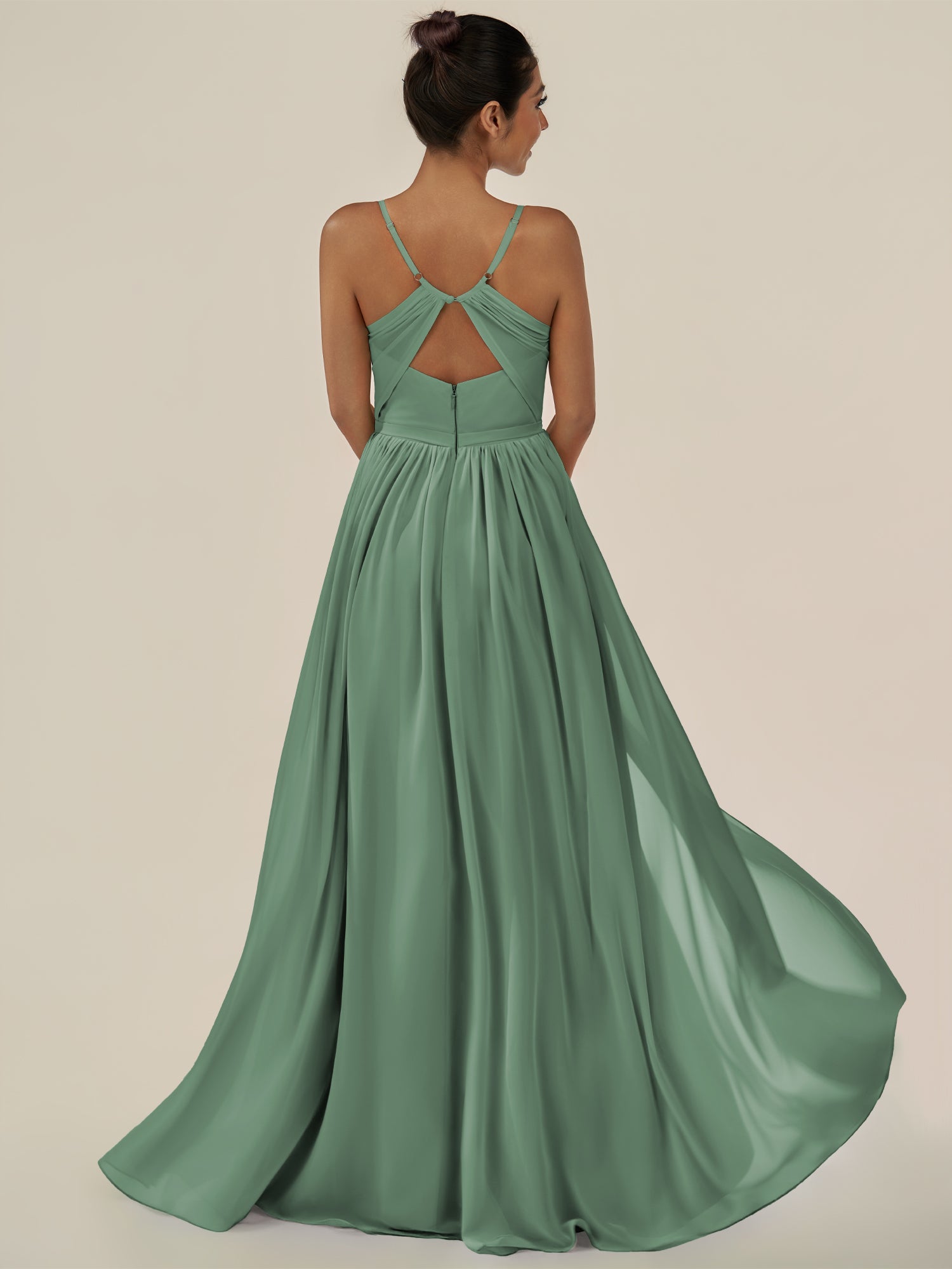 Irissa embodies graceful sophistication and modern charm. Crafted from soft chiffon, she features a flattering V-neckline and a sleeveless bodice that highlights the shoulders elegantly. Her floor-length A-line skirt flows effortlessly, enhanced by subtle pleats and a tasteful side slit for ease of movement. Finished with a smooth zipper back, Irissa is perfect for bridesmaids seeking a timeless and airy silhouette.