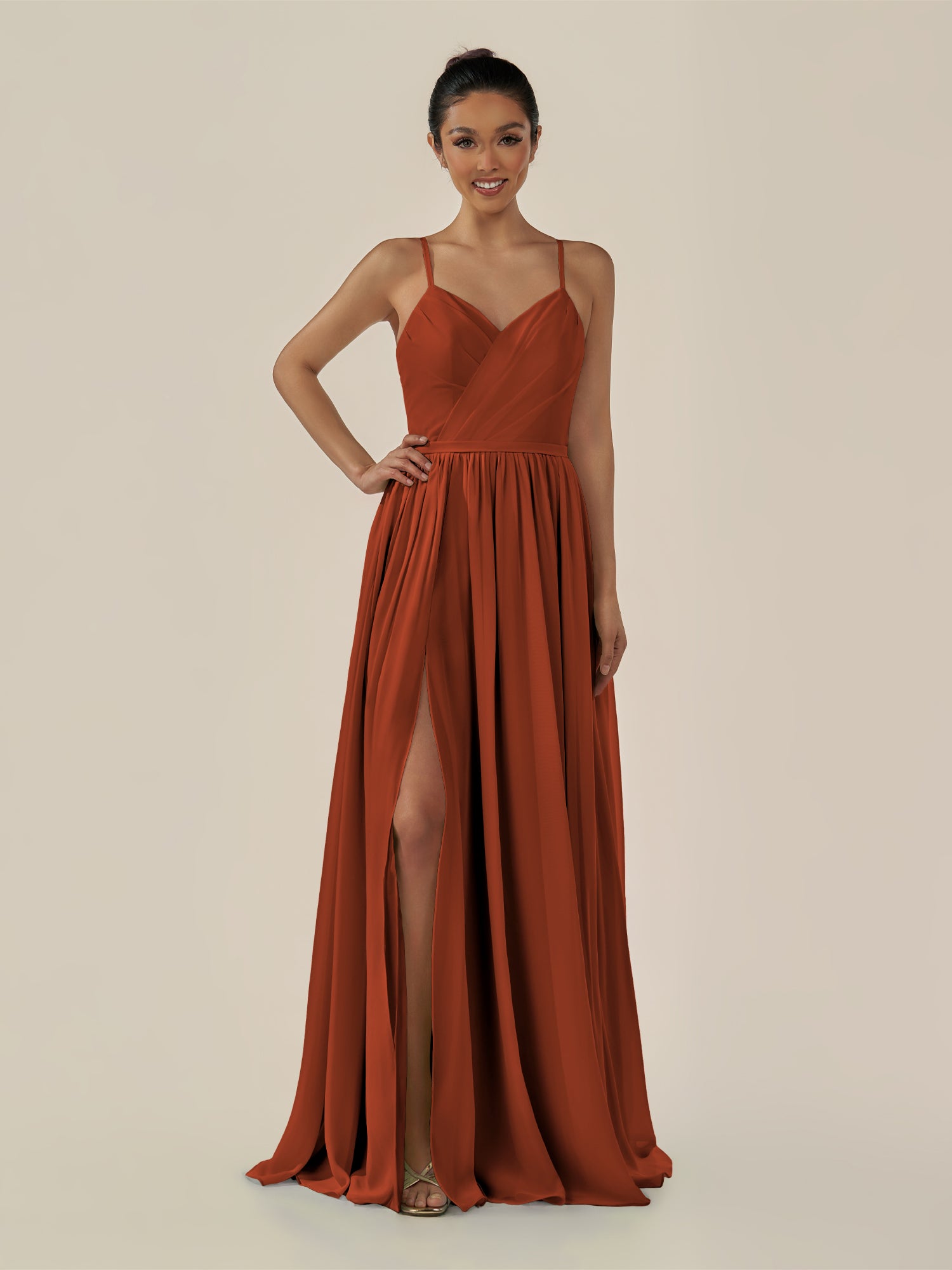 Irissa embodies graceful sophistication and modern charm. Crafted from soft chiffon, she features a flattering V-neckline and a sleeveless bodice that highlights the shoulders elegantly. Her floor-length A-line skirt flows effortlessly, enhanced by subtle pleats and a tasteful side slit for ease of movement. Finished with a smooth zipper back, Irissa is perfect for bridesmaids seeking a timeless and airy silhouette.