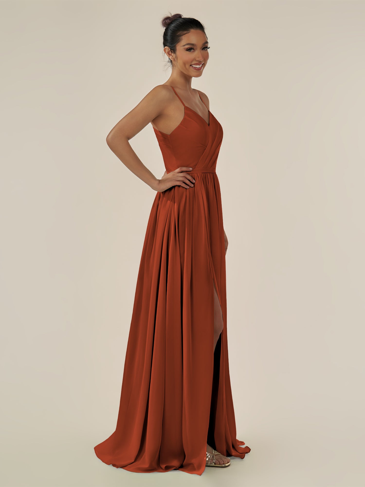 Irissa | Spice - A Line Chiffon V Neck Pleated Long Bridesmaid Dress with Slit