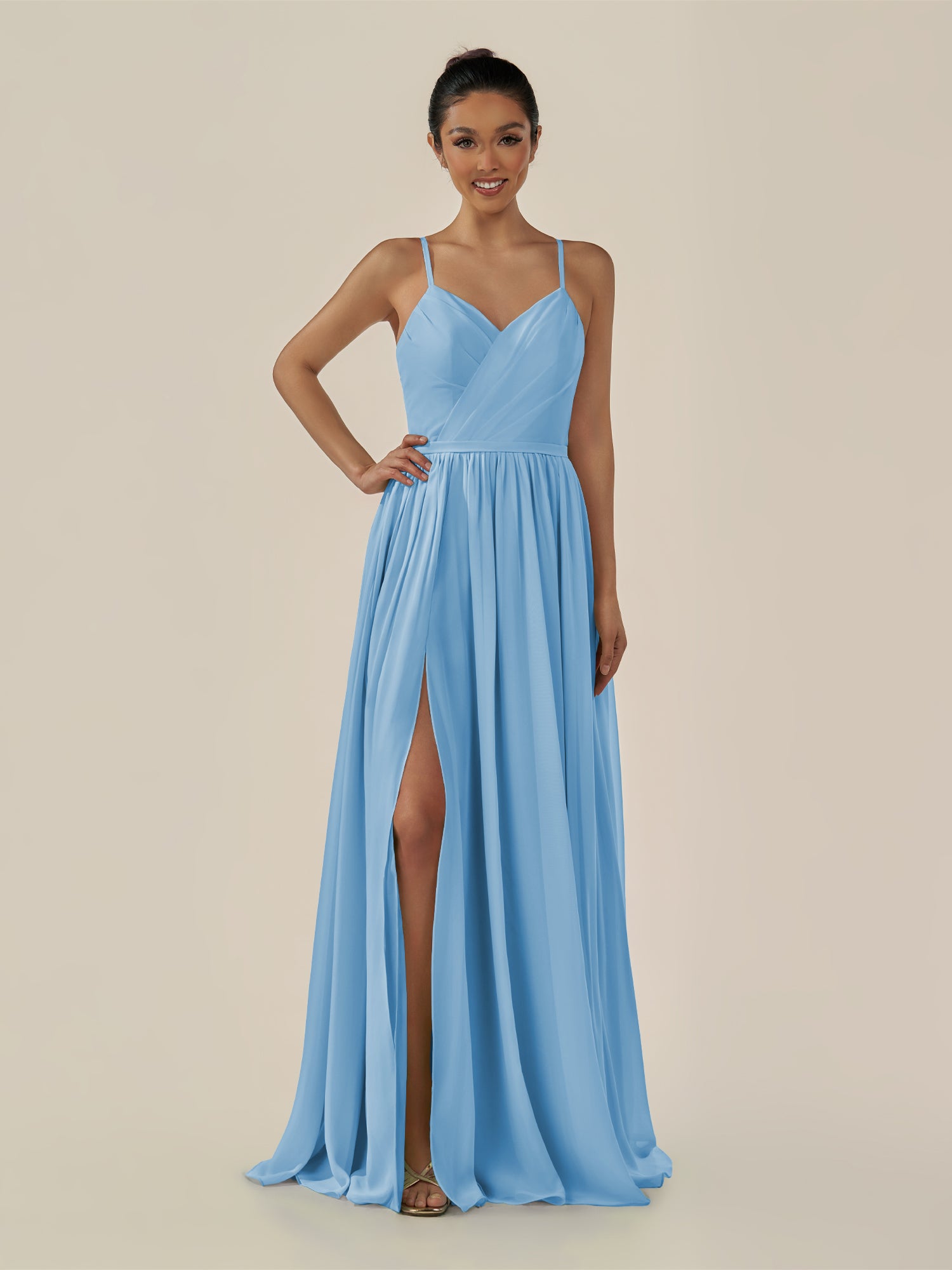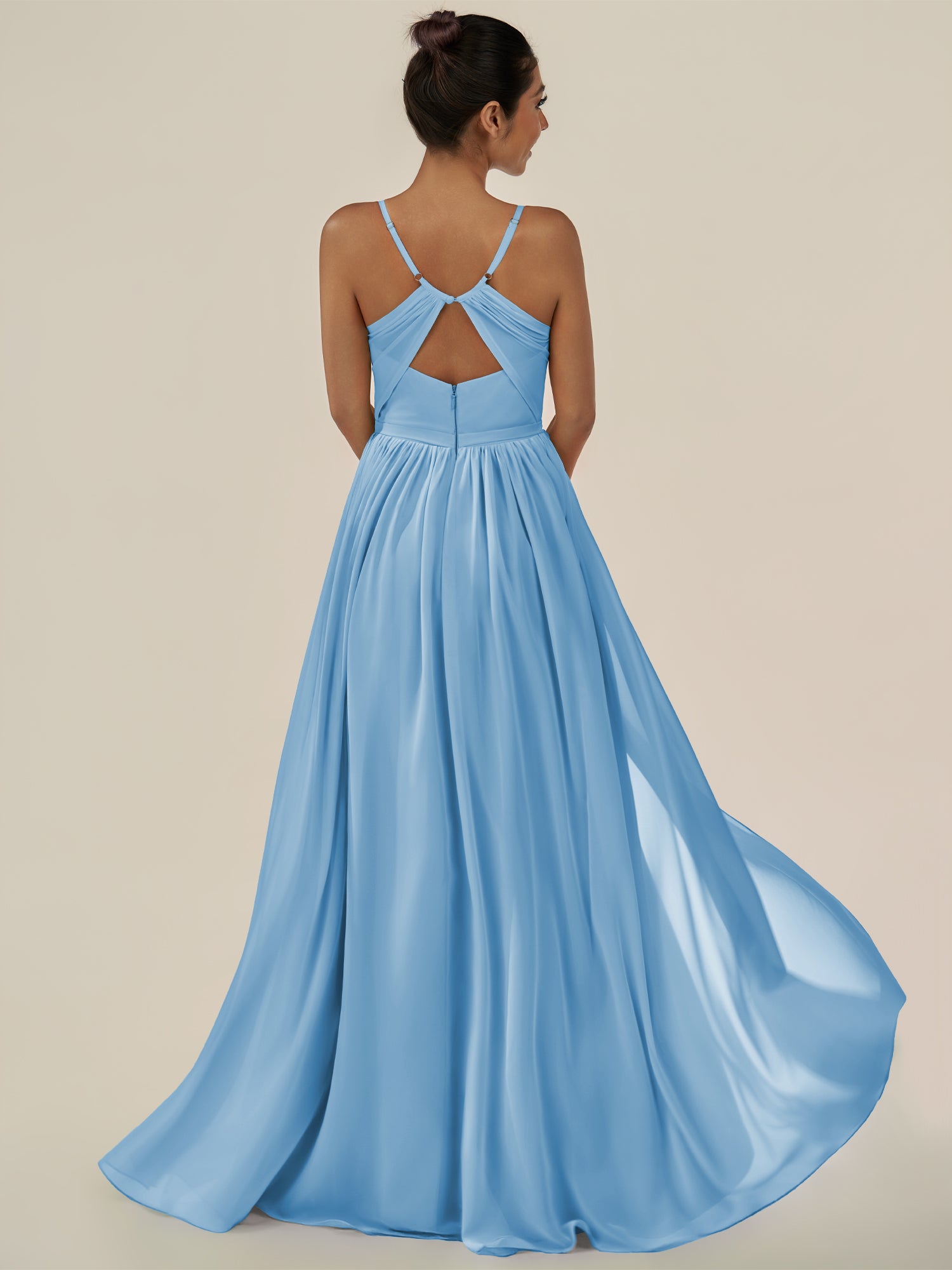 Irissa embodies graceful sophistication and modern charm. Crafted from soft chiffon, she features a flattering V-neckline and a sleeveless bodice that highlights the shoulders elegantly. Her floor-length A-line skirt flows effortlessly, enhanced by subtle pleats and a tasteful side slit for ease of movement. Finished with a smooth zipper back, Irissa is perfect for bridesmaids seeking a timeless and airy silhouette.