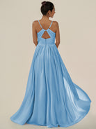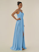 Irissa | Steel Blue - A Line Chiffon V Neck Pleated Long Bridesmaid Dress with Slit