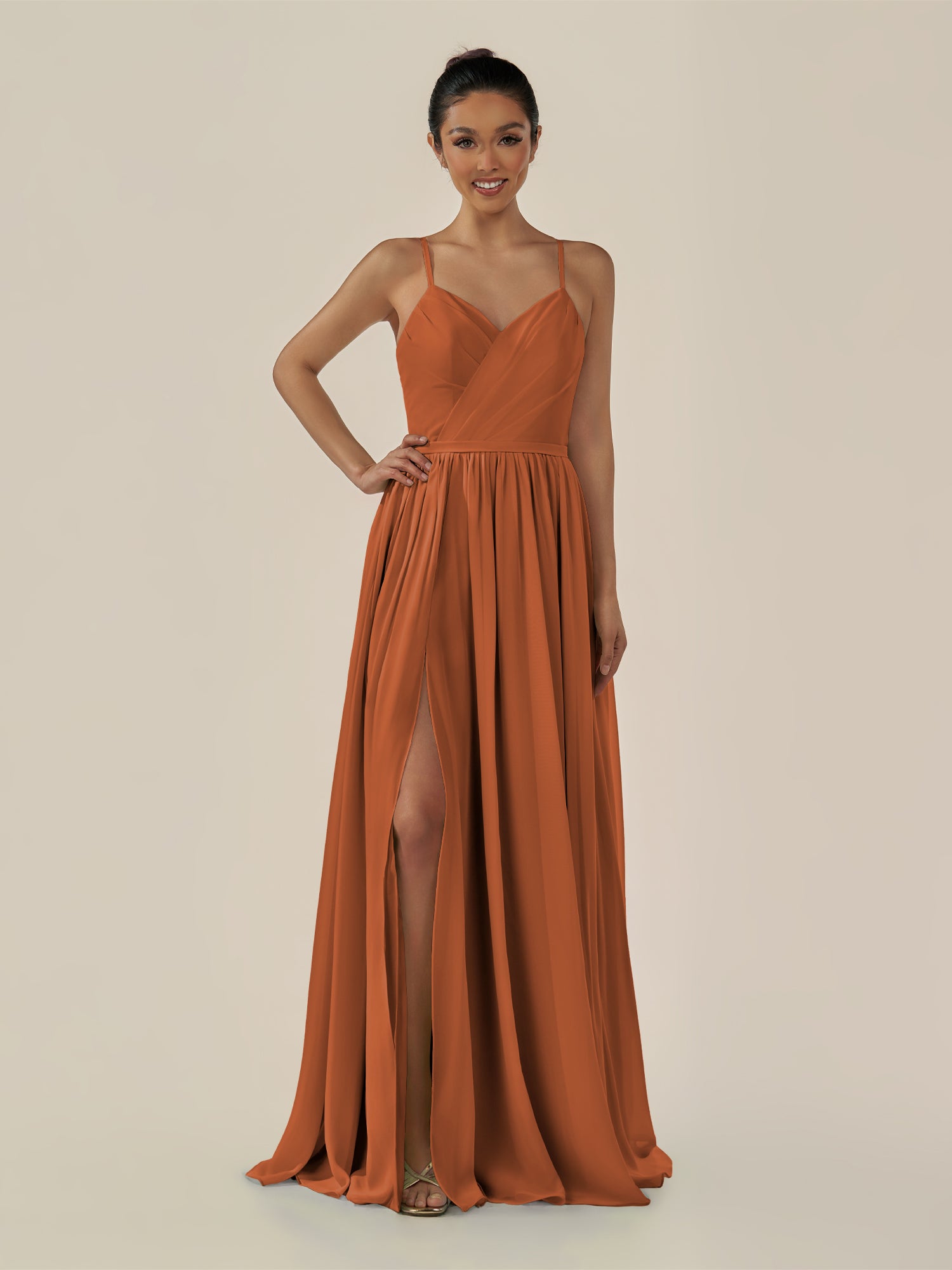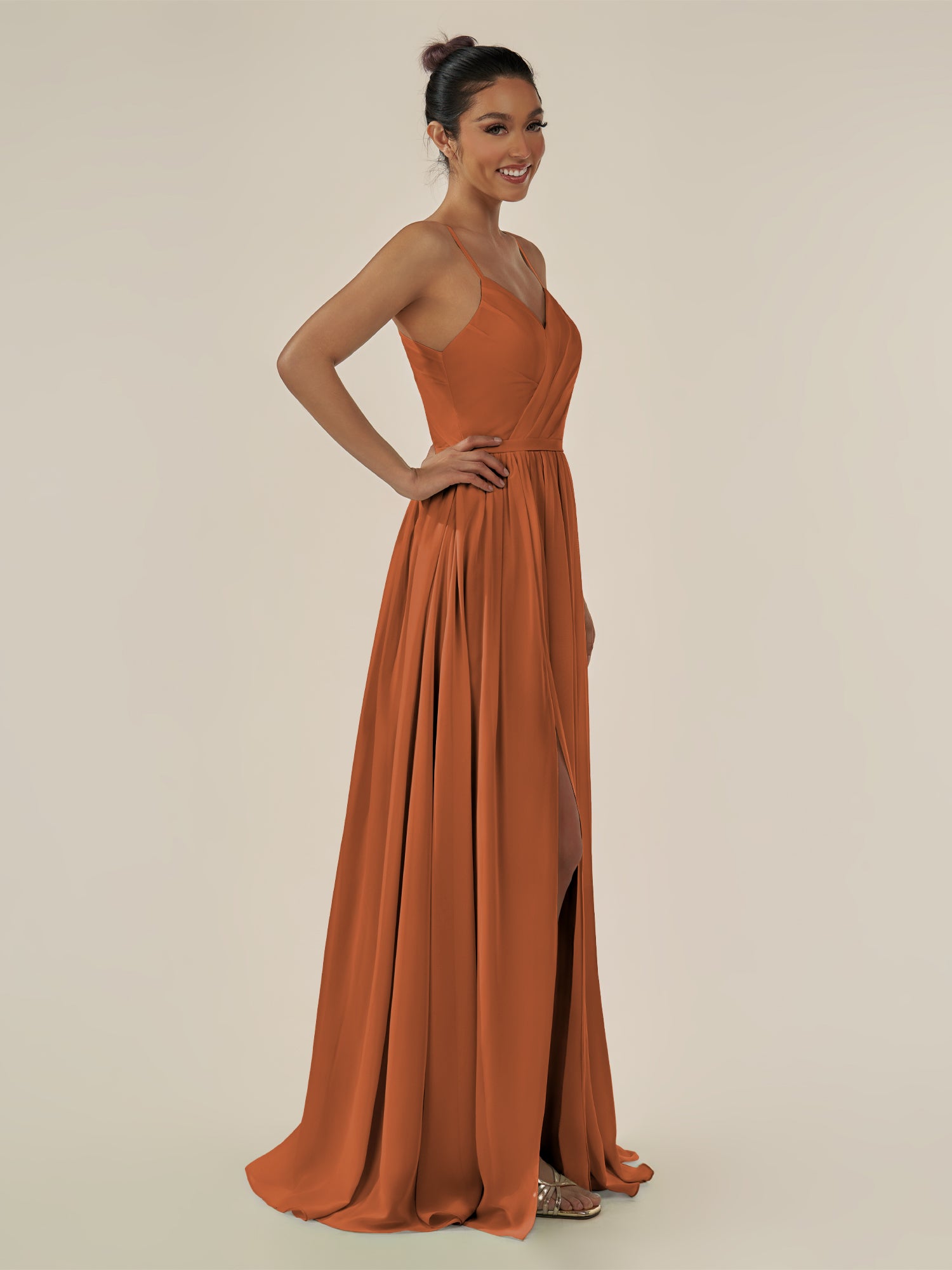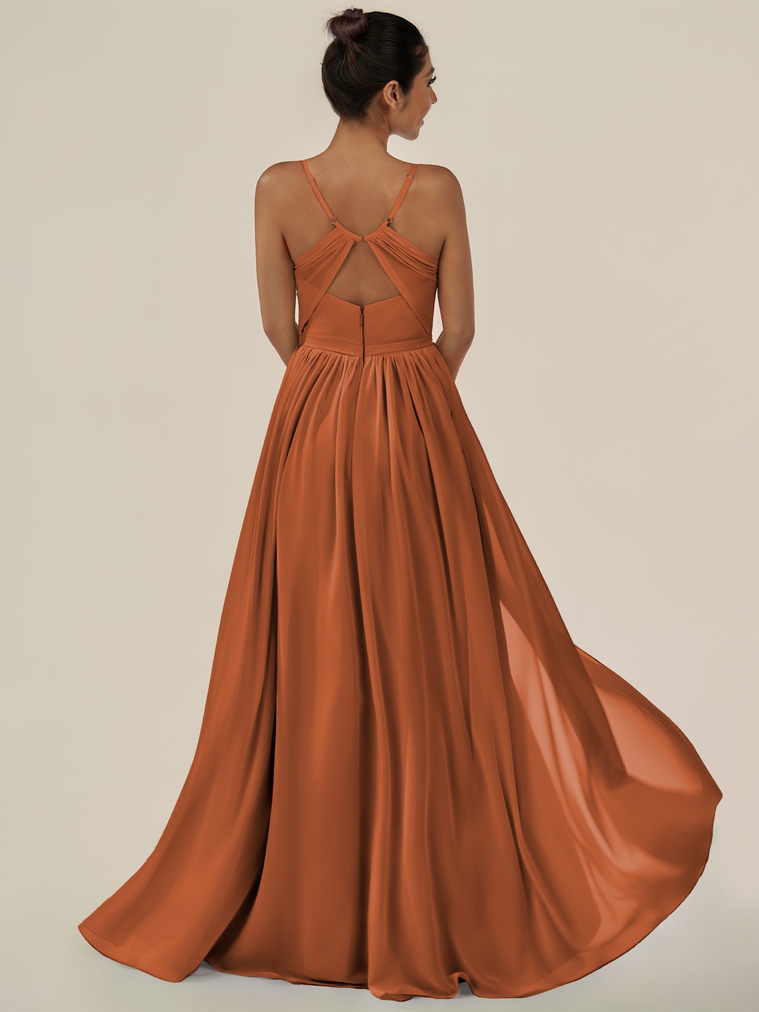 Irissa | Terracotta - A Line Chiffon V Neck Pleated Long Bridesmaid Dress with Slit