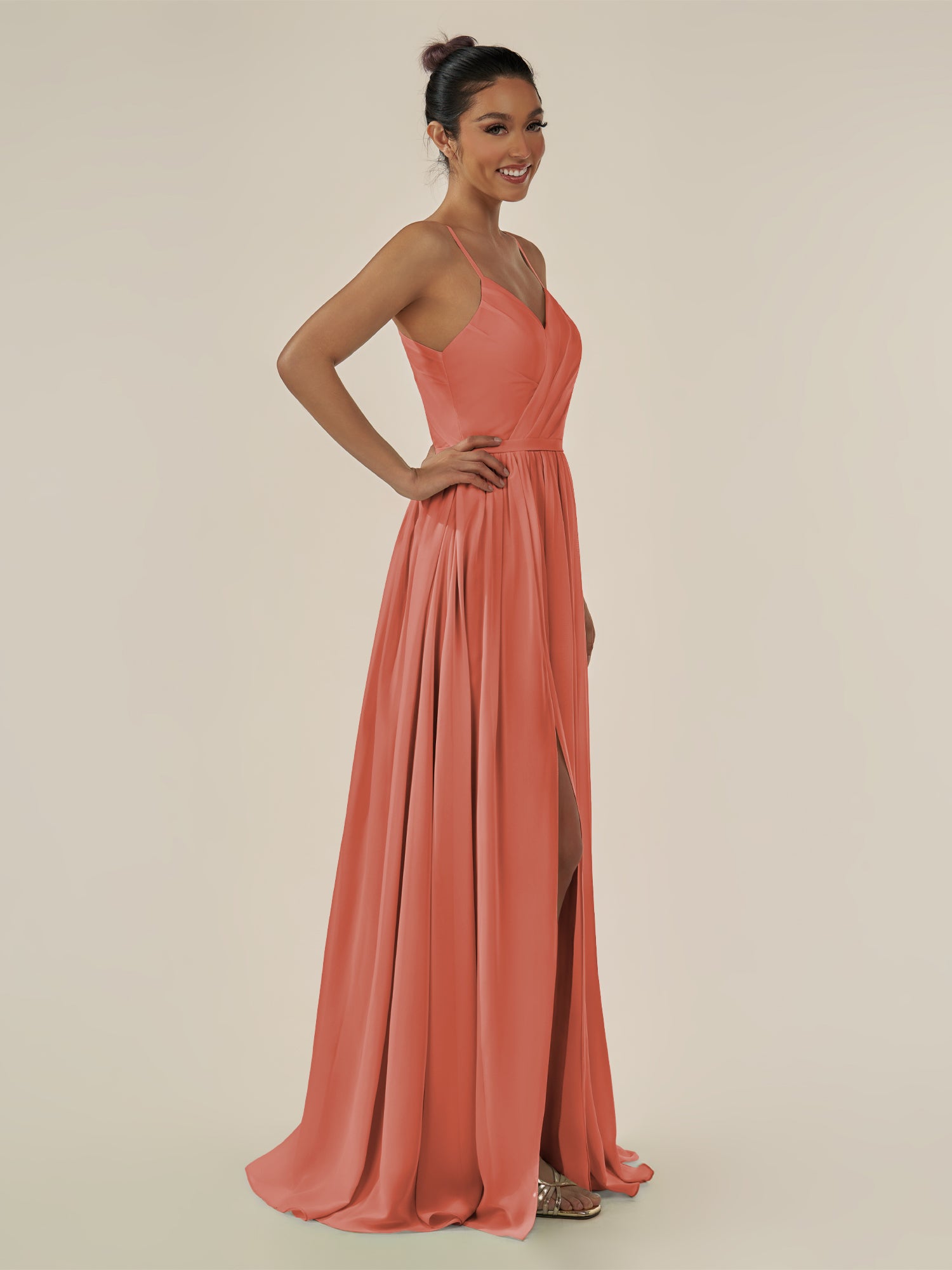 Irissa embodies graceful sophistication and modern charm. Crafted from soft chiffon, she features a flattering V-neckline and a sleeveless bodice that highlights the shoulders elegantly. Her floor-length A-line skirt flows effortlessly, enhanced by subtle pleats and a tasteful side slit for ease of movement. Finished with a smooth zipper back, Irissa is perfect for bridesmaids seeking a timeless and airy silhouette.