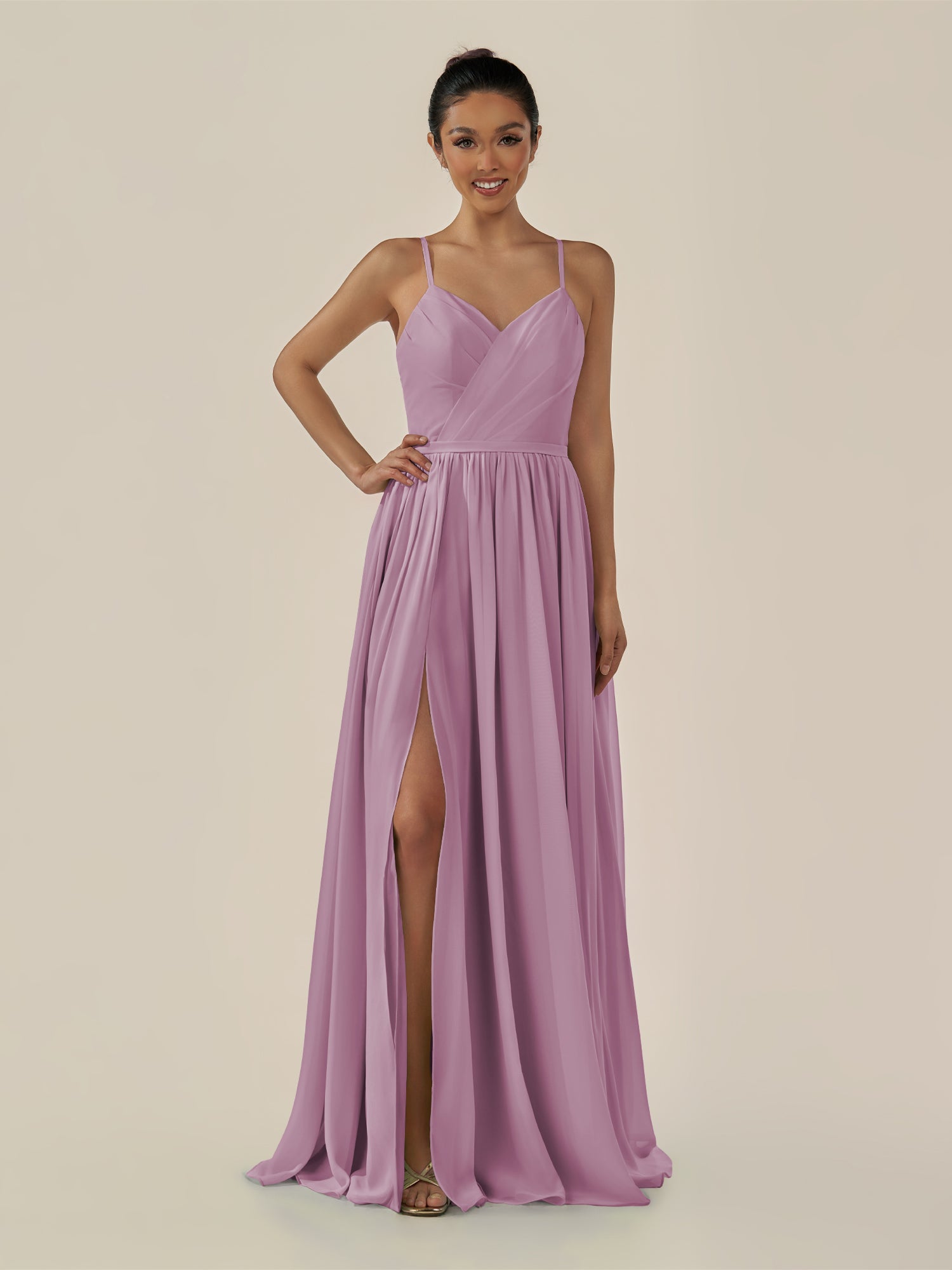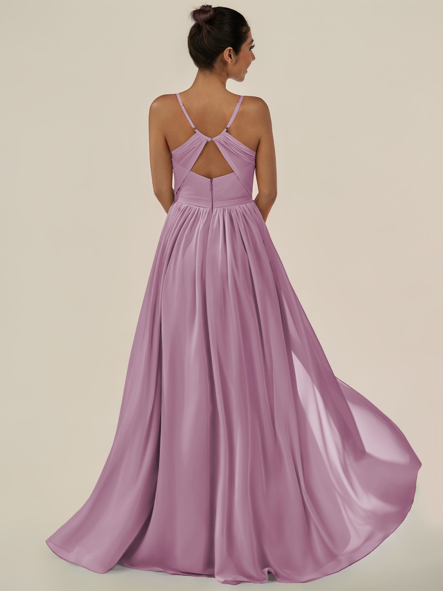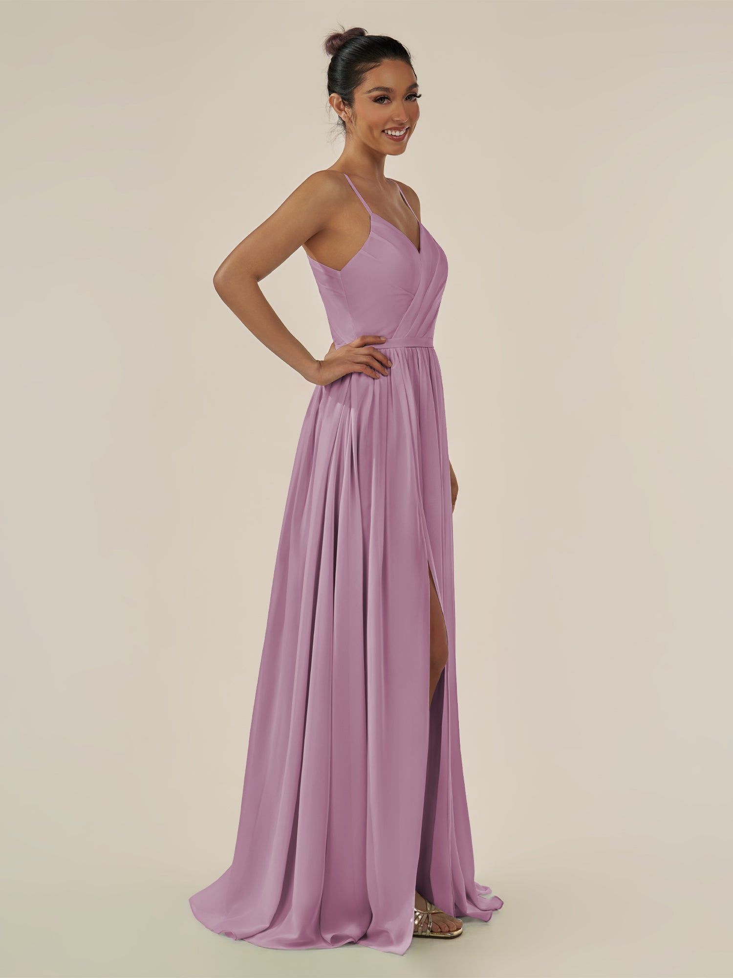 Irissa | Wisteria - A Line Chiffon V Neck Pleated Long Bridesmaid Dress with Slit
