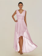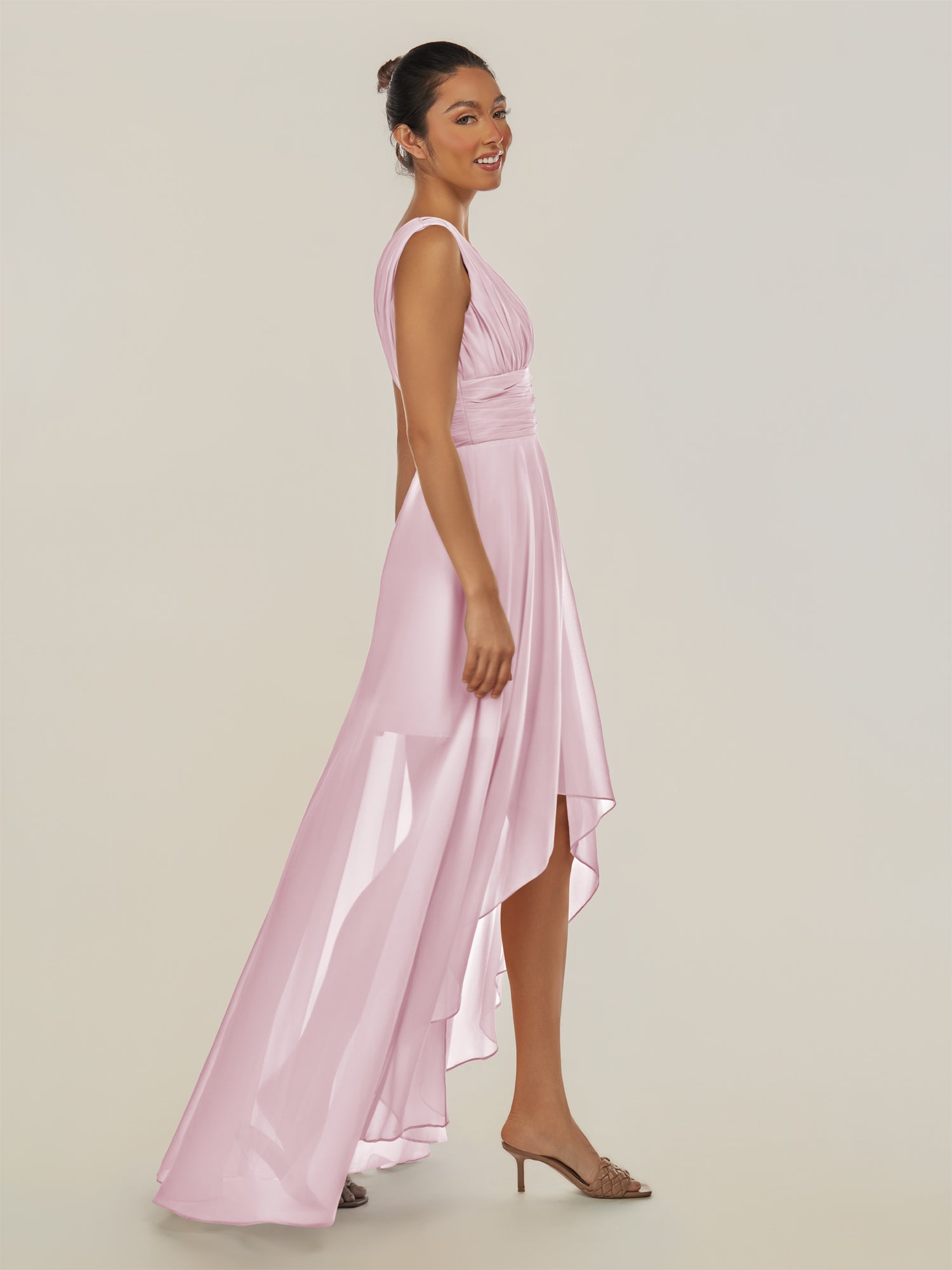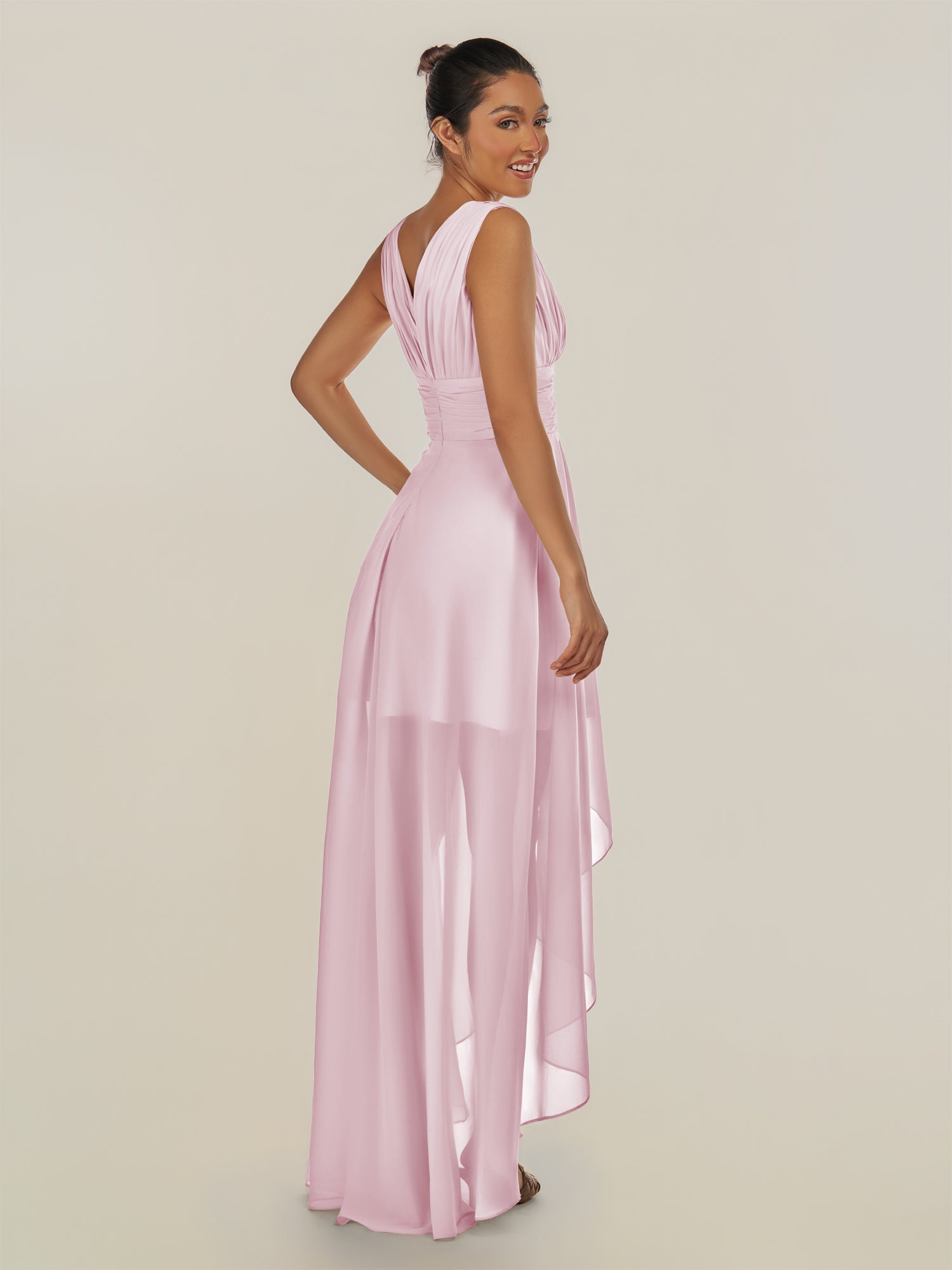 Jovi is a chic and modern choice for your bridal party. Crafted from soft chiffon, she features a flattering V-neckline and a sleeveless bodice for a timeless silhouette. Her high-low A-line skirt adds movement and visual interest, while delicate pleats enhance the elegant drape. Finished with a smooth zipper back, Jovi combines contemporary style with classic sophistication, perfect for weddings and special occasions.