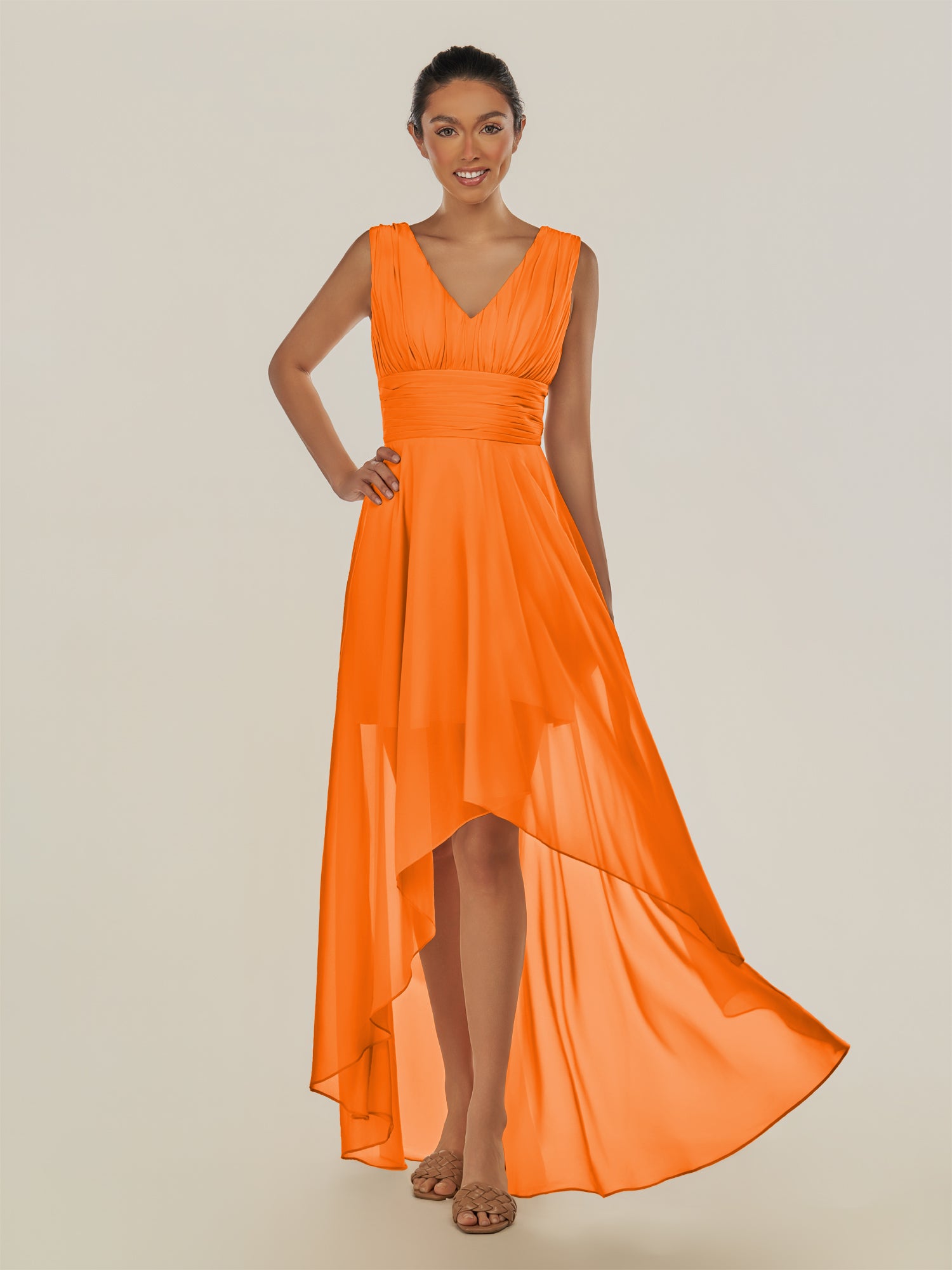 Jovi | Cinnamon - A Line Chiffon V Neck High-low Length Pleated Long Bridesmaid Dress