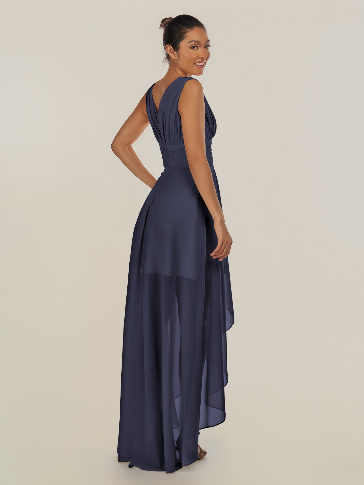 Jovi | Dusk Blue - A Line Chiffon V Neck High-low Length Pleated Long Bridesmaid Dress