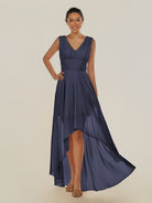 Jovi is a chic and modern choice for your bridal party. Crafted from soft chiffon, she features a flattering V-neckline and a sleeveless bodice for a timeless silhouette. Her high-low A-line skirt adds movement and visual interest, while delicate pleats enhance the elegant drape. Finished with a smooth zipper back, Jovi combines contemporary style with classic sophistication, perfect for weddings and special occasions.