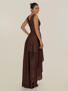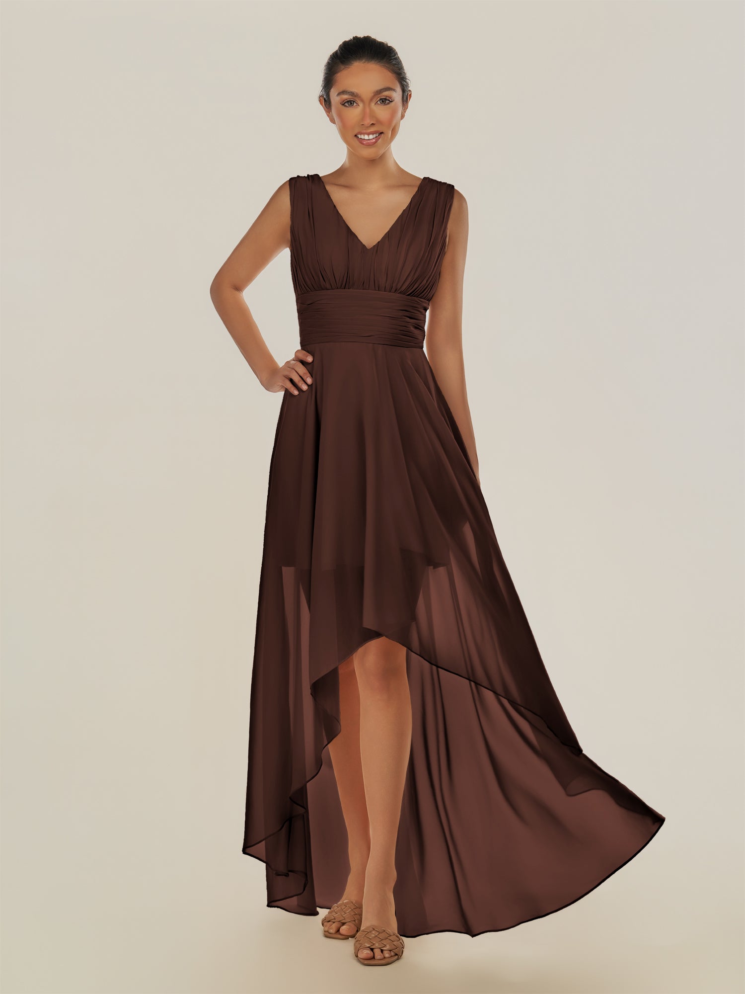 Jovi | Espresso - A Line Chiffon V Neck High-low Length Pleated Long Bridesmaid Dress