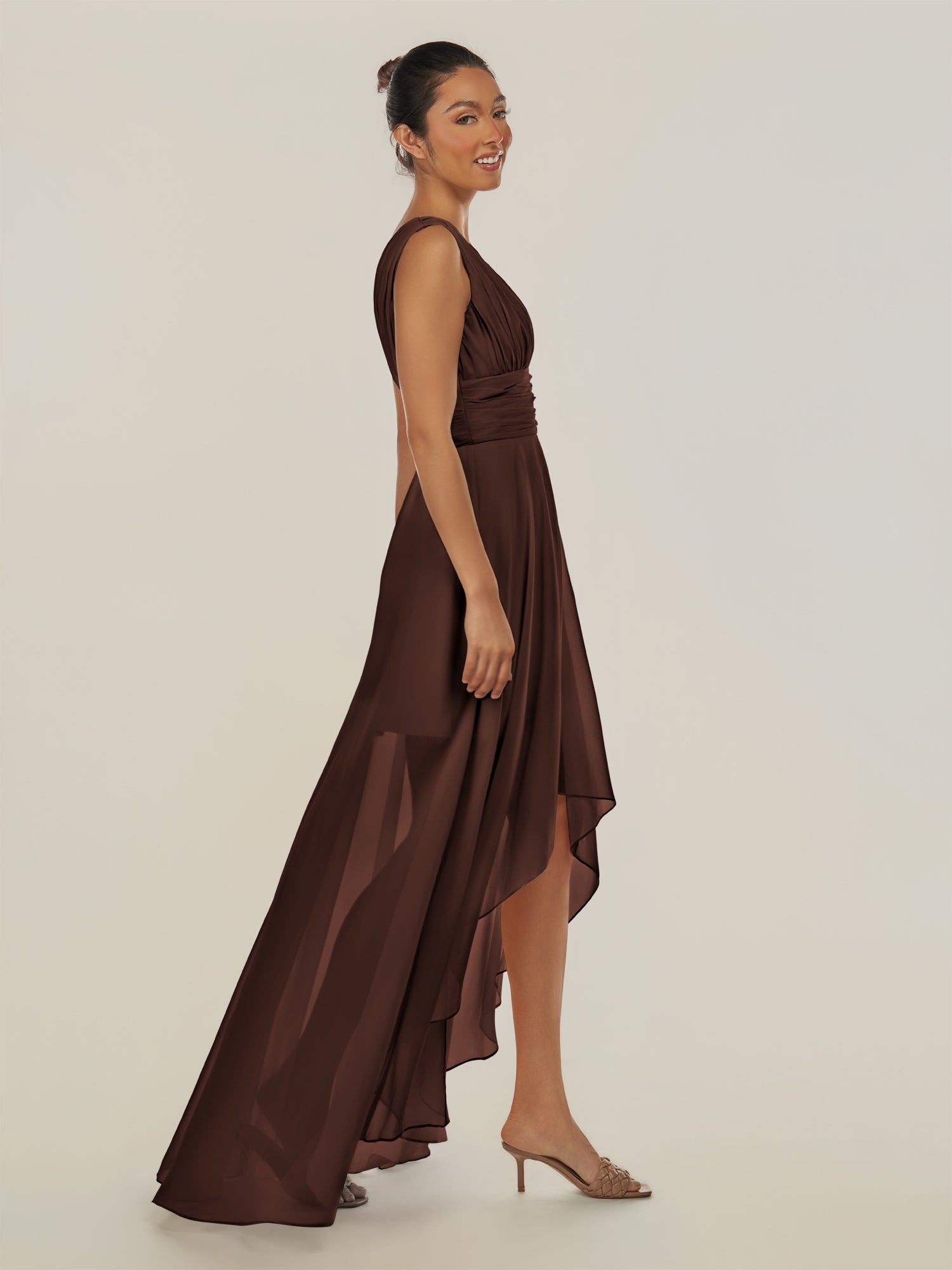 Jovi is a chic and modern choice for your bridal party. Crafted from soft chiffon, she features a flattering V-neckline and a sleeveless bodice for a timeless silhouette. Her high-low A-line skirt adds movement and visual interest, while delicate pleats enhance the elegant drape. Finished with a smooth zipper back, Jovi combines contemporary style with classic sophistication, perfect for weddings and special occasions.