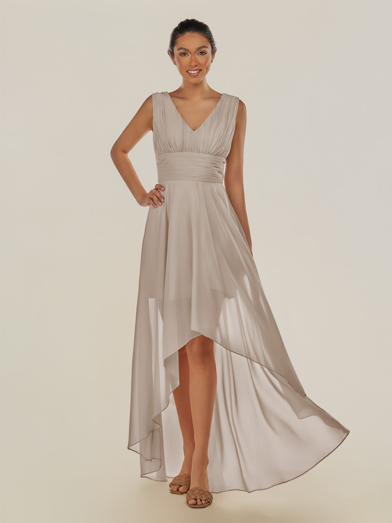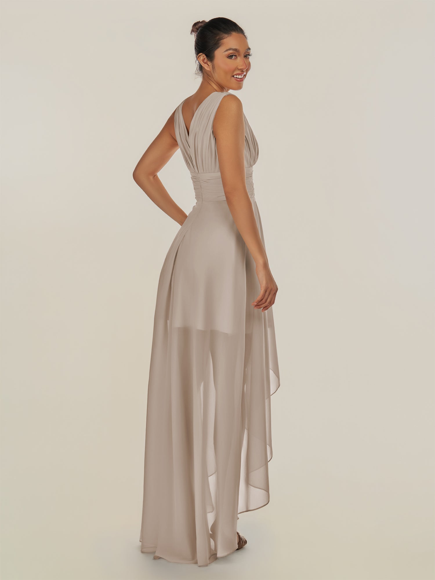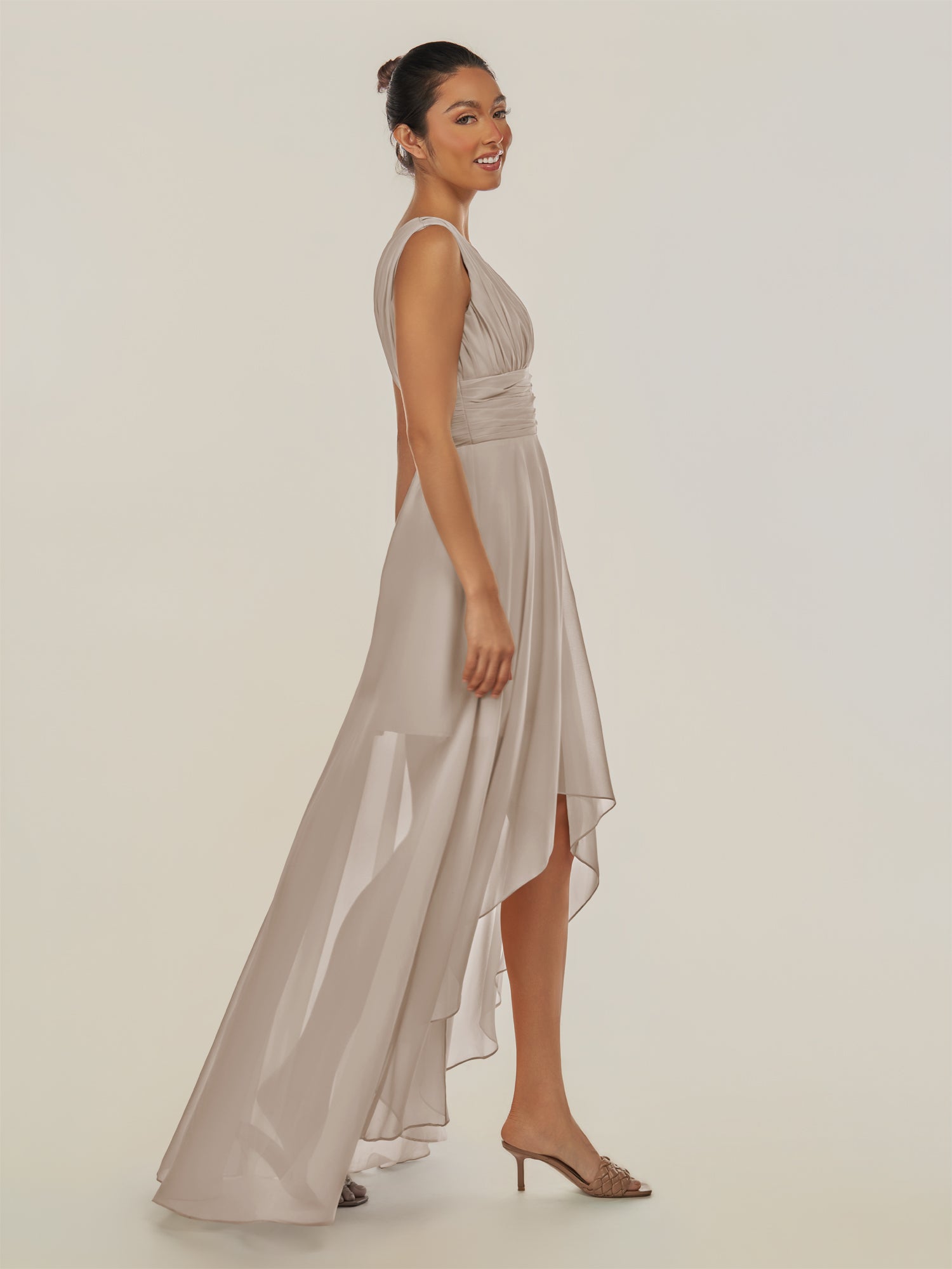Jovi is a chic and modern choice for your bridal party. Crafted from soft chiffon, she features a flattering V-neckline and a sleeveless bodice for a timeless silhouette. Her high-low A-line skirt adds movement and visual interest, while delicate pleats enhance the elegant drape. Finished with a smooth zipper back, Jovi combines contemporary style with classic sophistication, perfect for weddings and special occasions.