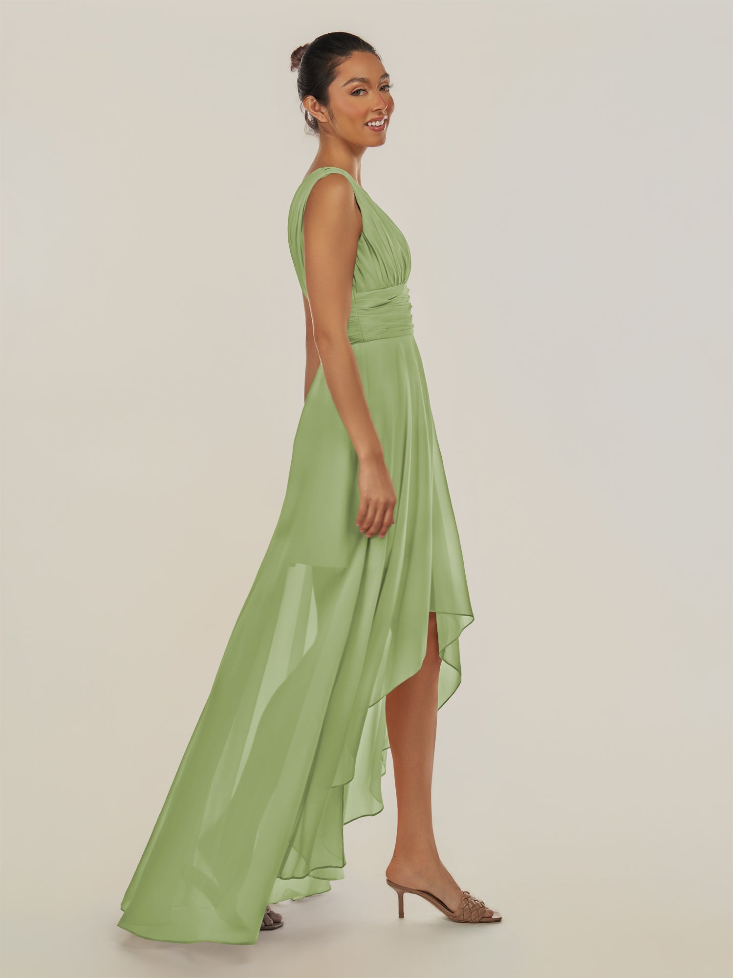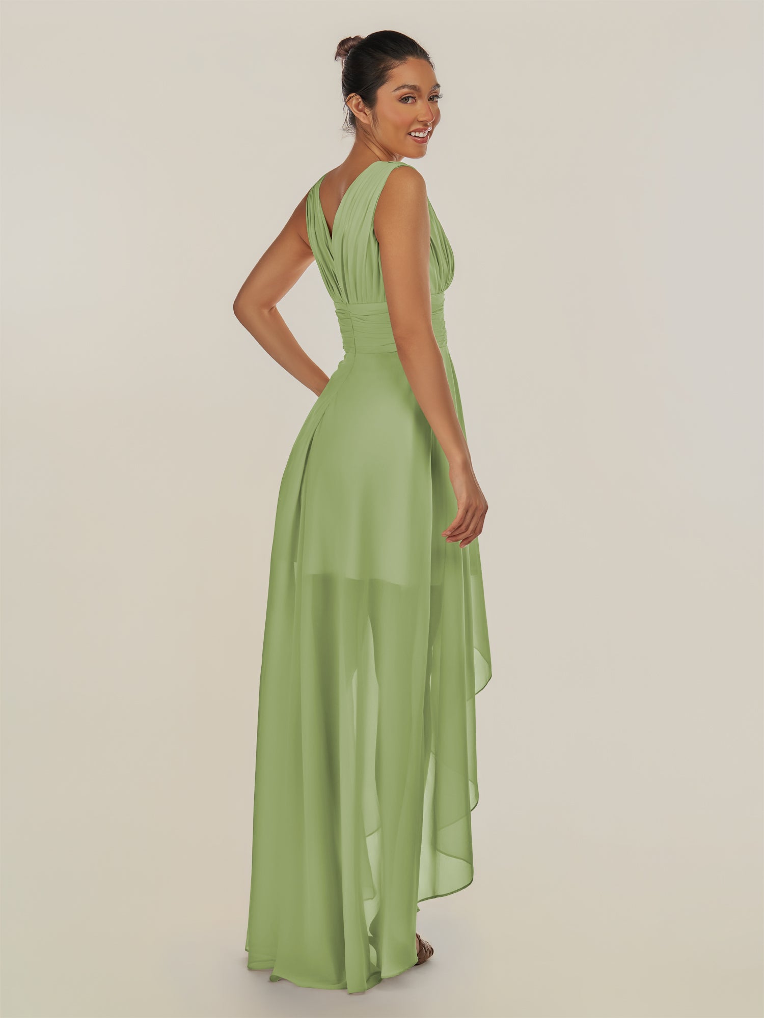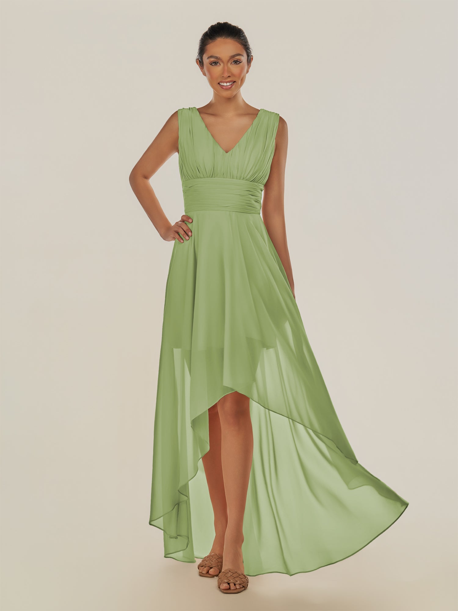 Jovi | Matcha - A Line Chiffon V Neck High-low Length Pleated Long Bridesmaid Dress