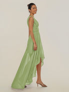 Jovi is a chic and modern choice for your bridal party. Crafted from soft chiffon, she features a flattering V-neckline and a sleeveless bodice for a timeless silhouette. Her high-low A-line skirt adds movement and visual interest, while delicate pleats enhance the elegant drape. Finished with a smooth zipper back, Jovi combines contemporary style with classic sophistication, perfect for weddings and special occasions.