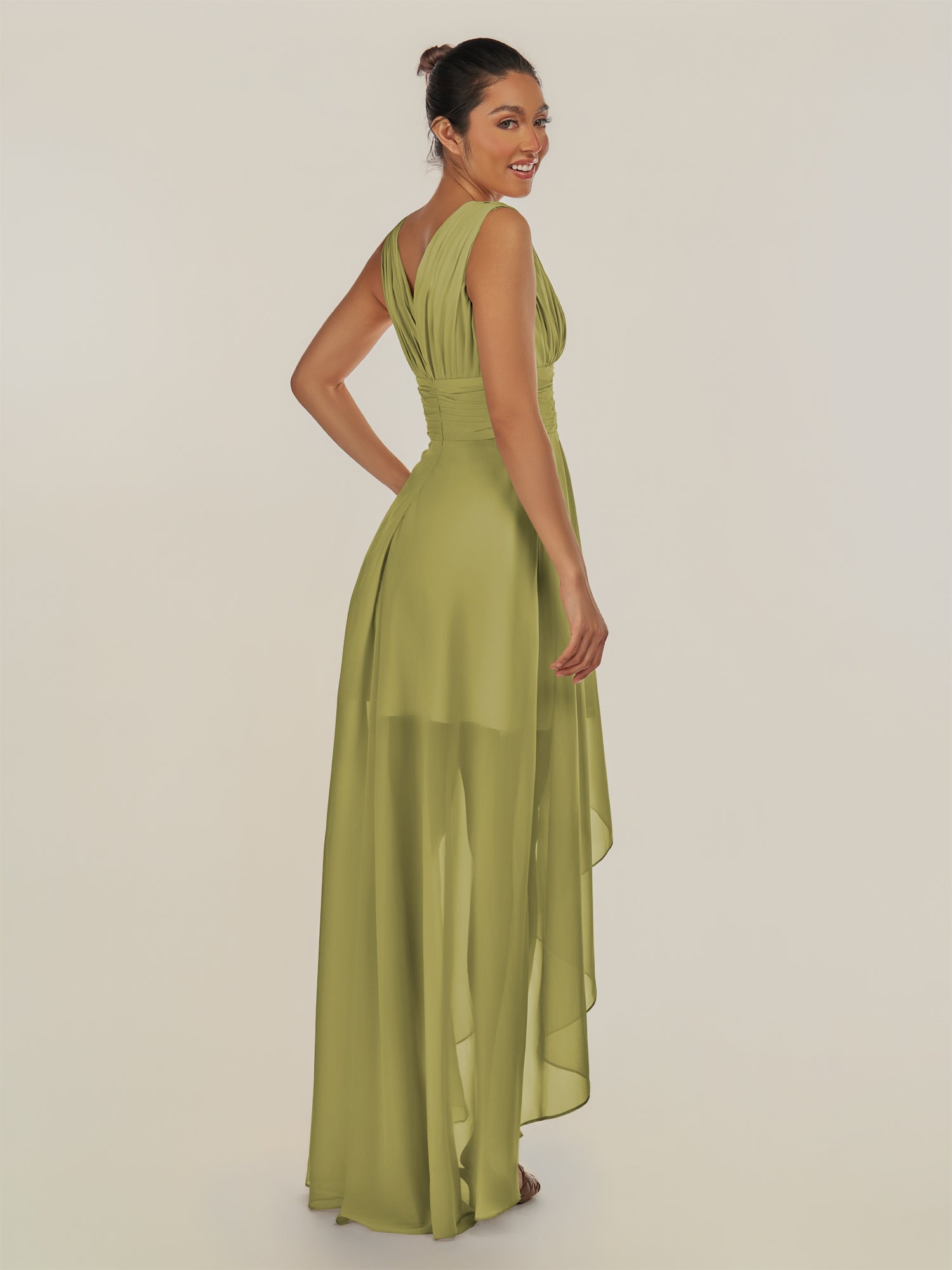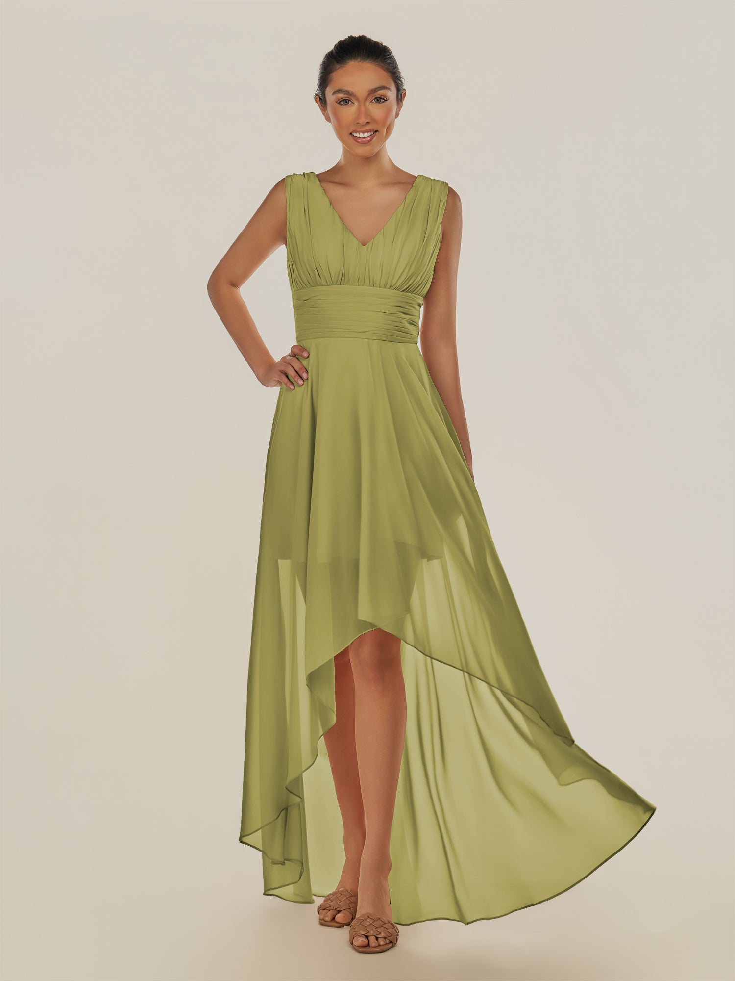 Jovi is a chic and modern choice for your bridal party. Crafted from soft chiffon, she features a flattering V-neckline and a sleeveless bodice for a timeless silhouette. Her high-low A-line skirt adds movement and visual interest, while delicate pleats enhance the elegant drape. Finished with a smooth zipper back, Jovi combines contemporary style with classic sophistication, perfect for weddings and special occasions.