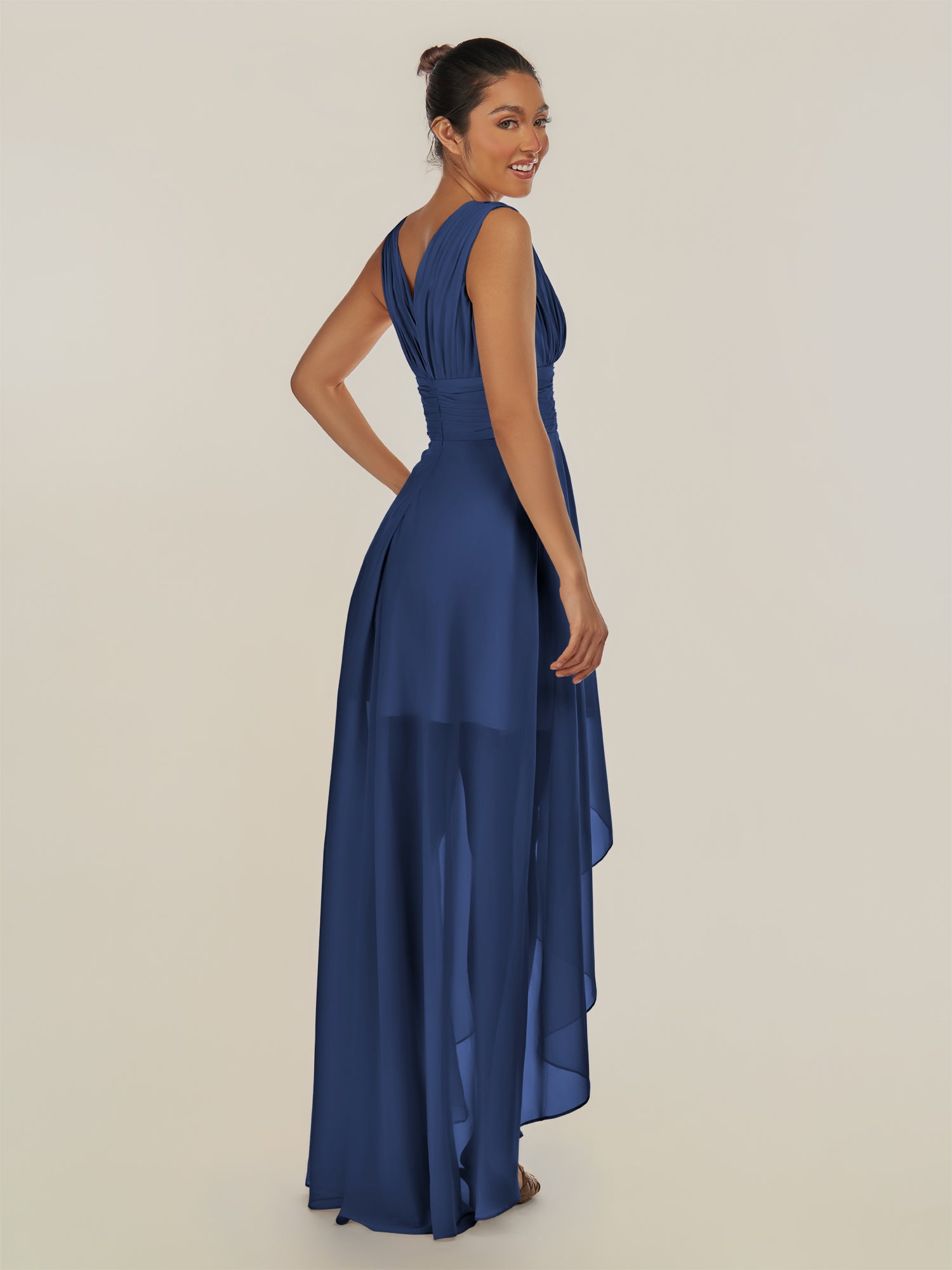 Jovi | Navy - A Line Chiffon V Neck High-low Length Pleated Long Bridesmaid Dress