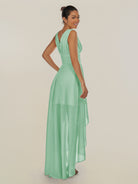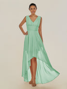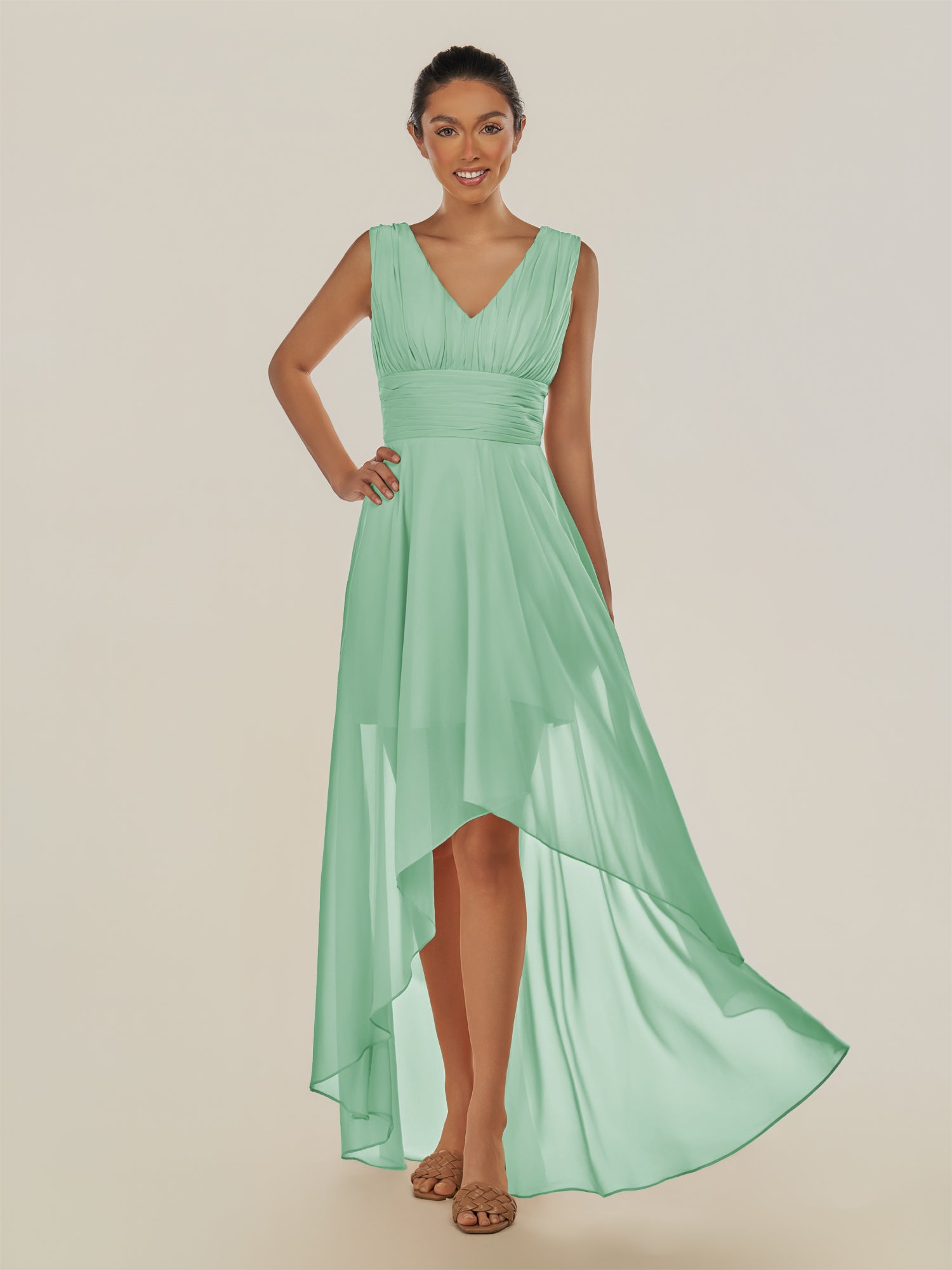 Jovi | Pale Pistachio - A Line Chiffon V Neck High-low Length Pleated Long Bridesmaid Dress