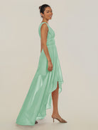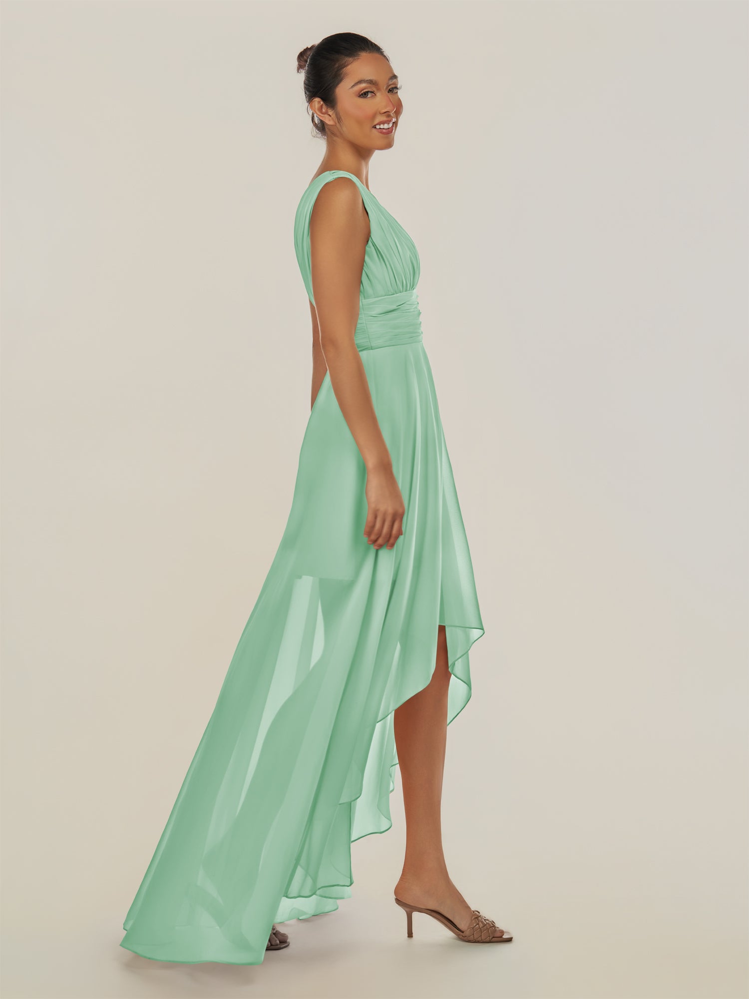 Jovi is a chic and modern choice for your bridal party. Crafted from soft chiffon, she features a flattering V-neckline and a sleeveless bodice for a timeless silhouette. Her high-low A-line skirt adds movement and visual interest, while delicate pleats enhance the elegant drape. Finished with a smooth zipper back, Jovi combines contemporary style with classic sophistication, perfect for weddings and special occasions.