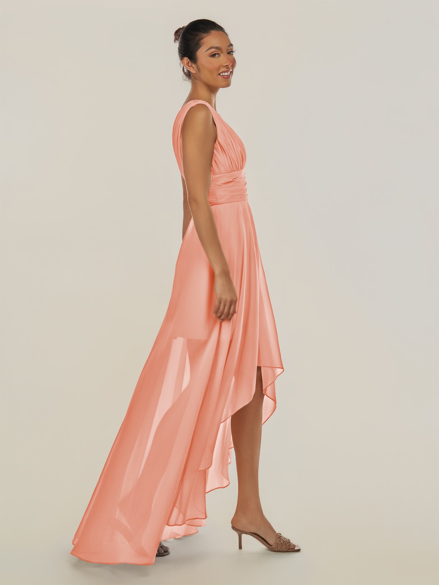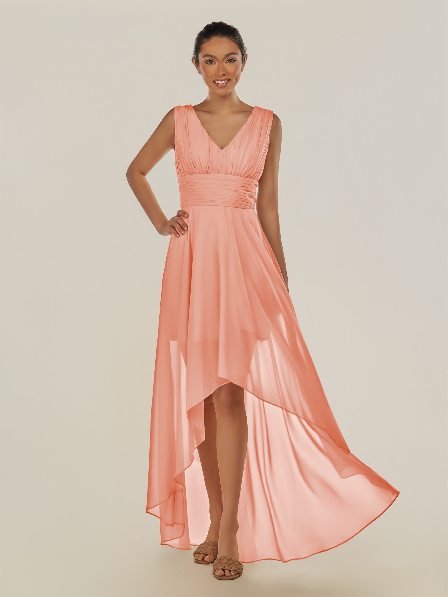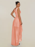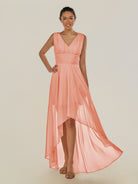 Jovi is a chic and modern choice for your bridal party. Crafted from soft chiffon, she features a flattering V-neckline and a sleeveless bodice for a timeless silhouette. Her high-low A-line skirt adds movement and visual interest, while delicate pleats enhance the elegant drape. Finished with a smooth zipper back, Jovi combines contemporary style with classic sophistication, perfect for weddings and special occasions.