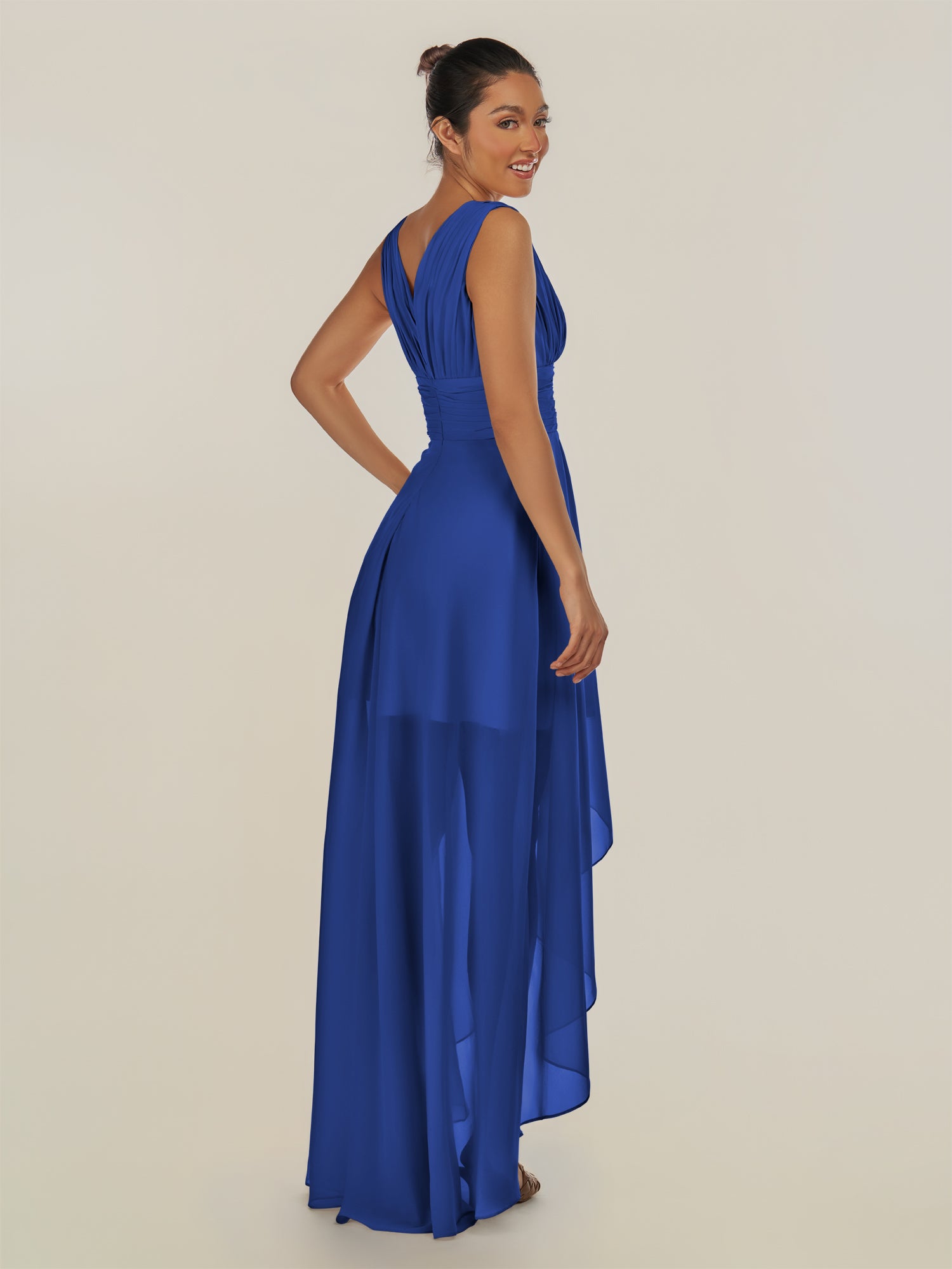Jovi | Royal Blue - A Line Chiffon V Neck High-low Length Pleated Long Bridesmaid Dress
