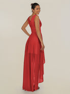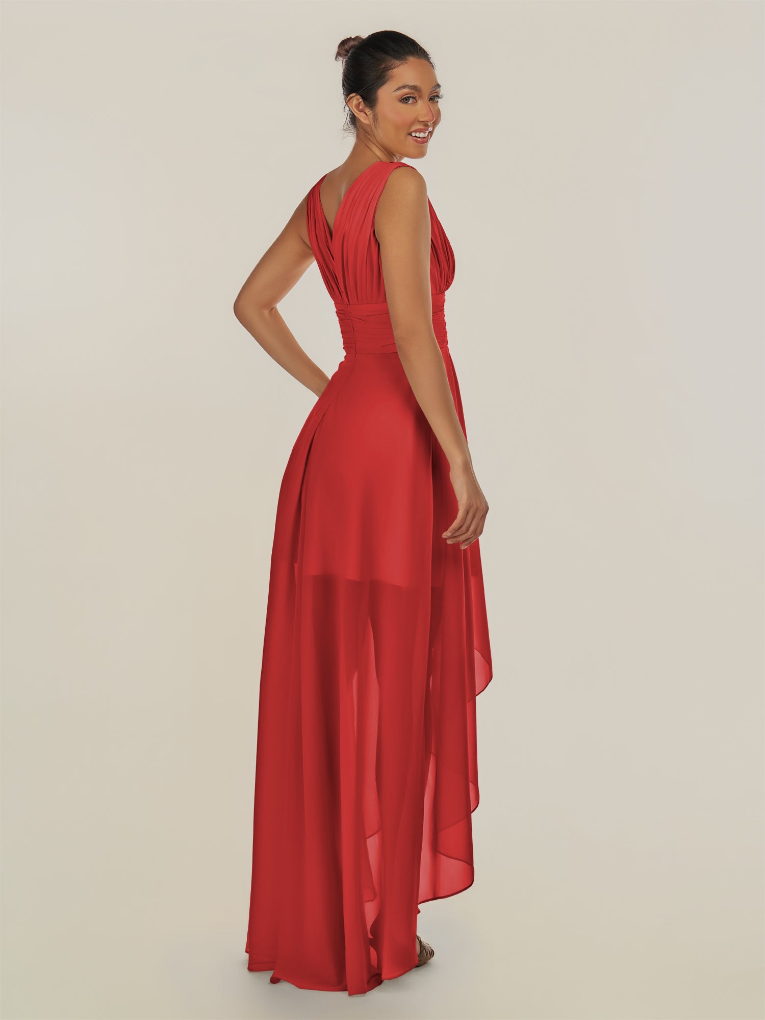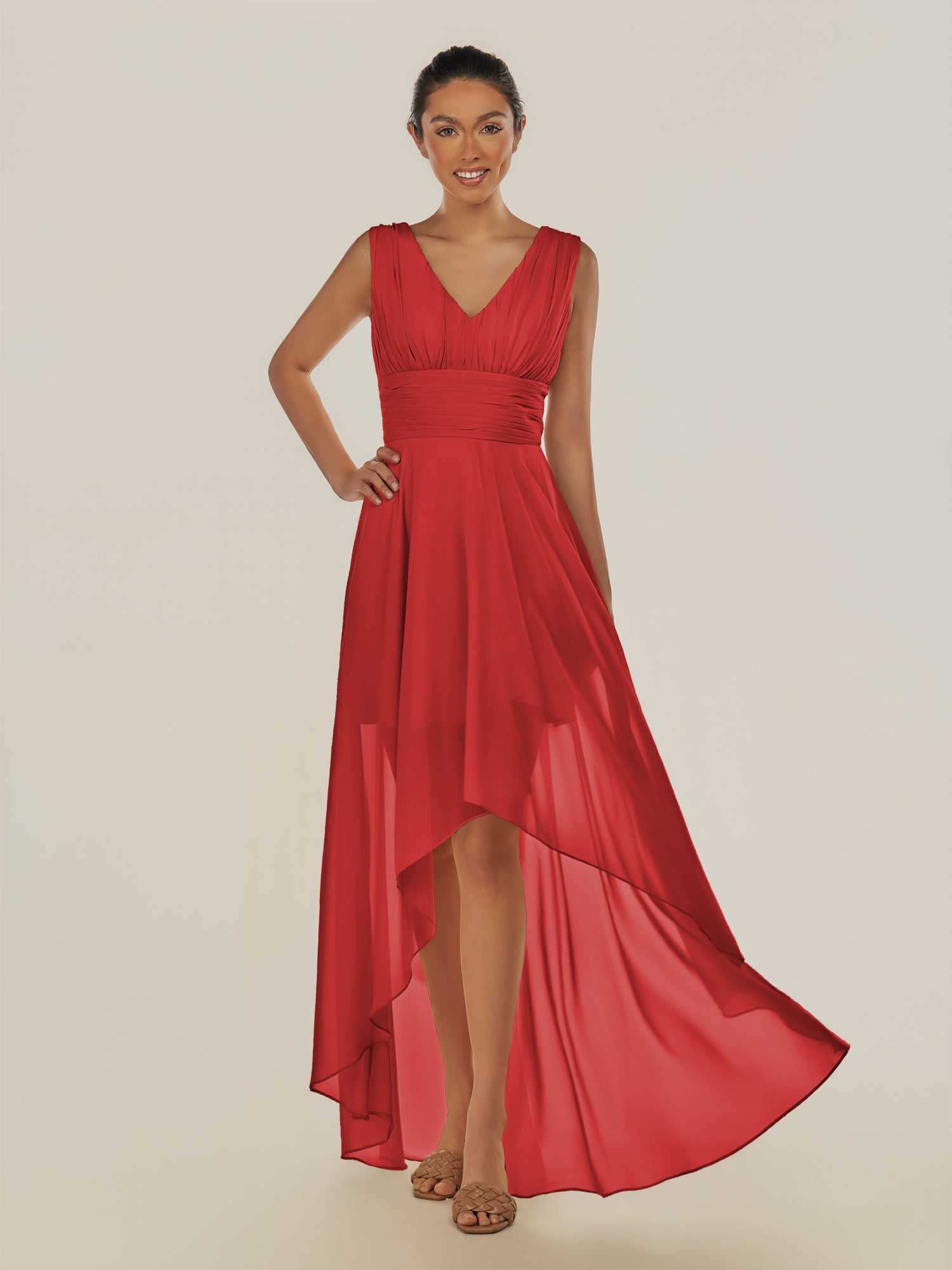 Jovi | Ruby Red - A Line Chiffon V Neck High-low Length Pleated Long Bridesmaid Dress