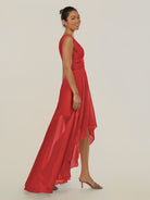 Jovi is a chic and modern choice for your bridal party. Crafted from soft chiffon, she features a flattering V-neckline and a sleeveless bodice for a timeless silhouette. Her high-low A-line skirt adds movement and visual interest, while delicate pleats enhance the elegant drape. Finished with a smooth zipper back, Jovi combines contemporary style with classic sophistication, perfect for weddings and special occasions.