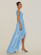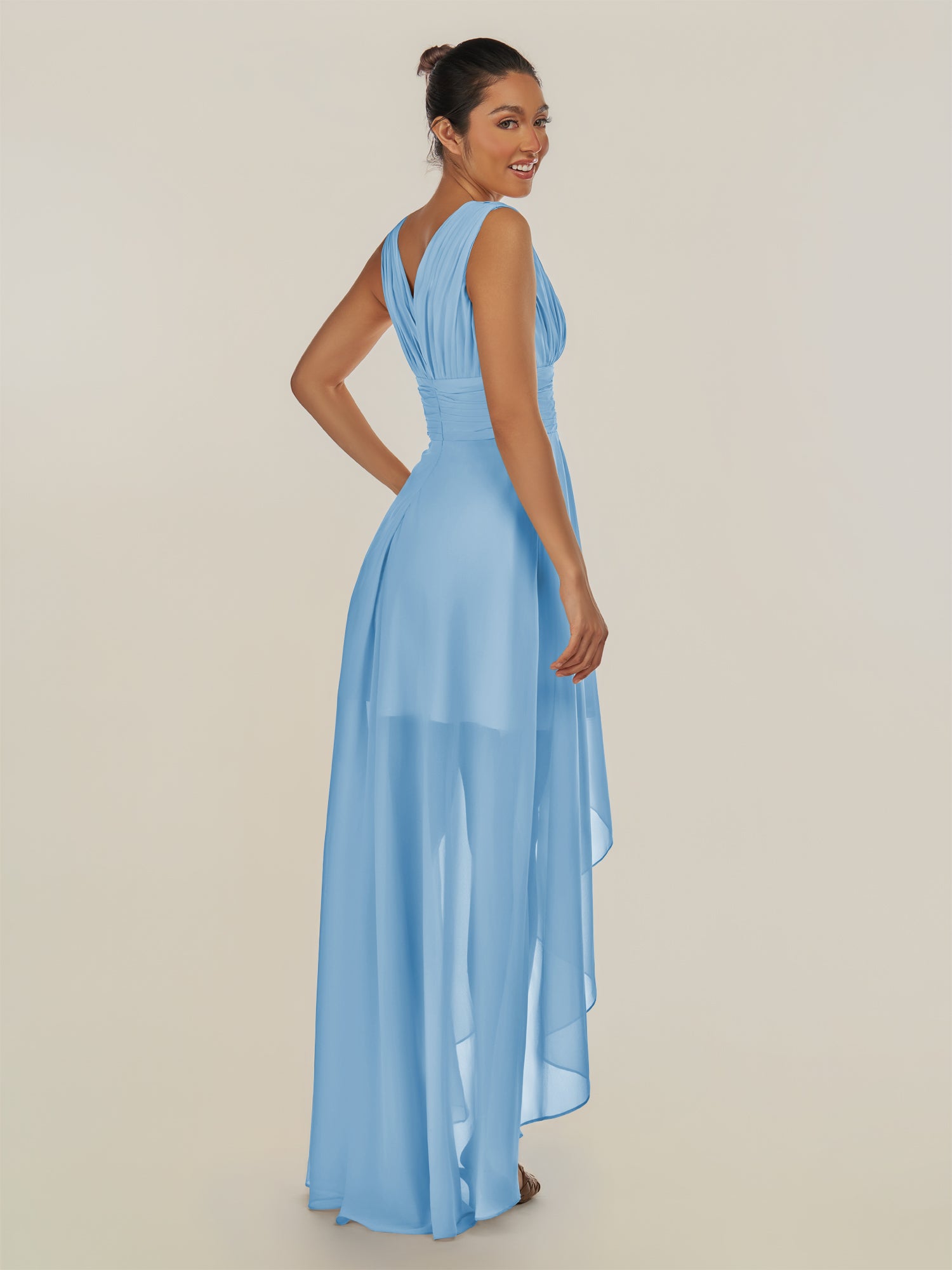 Jovi | Steel Blue - A Line Chiffon V Neck High-low Length Pleated Long Bridesmaid Dress
