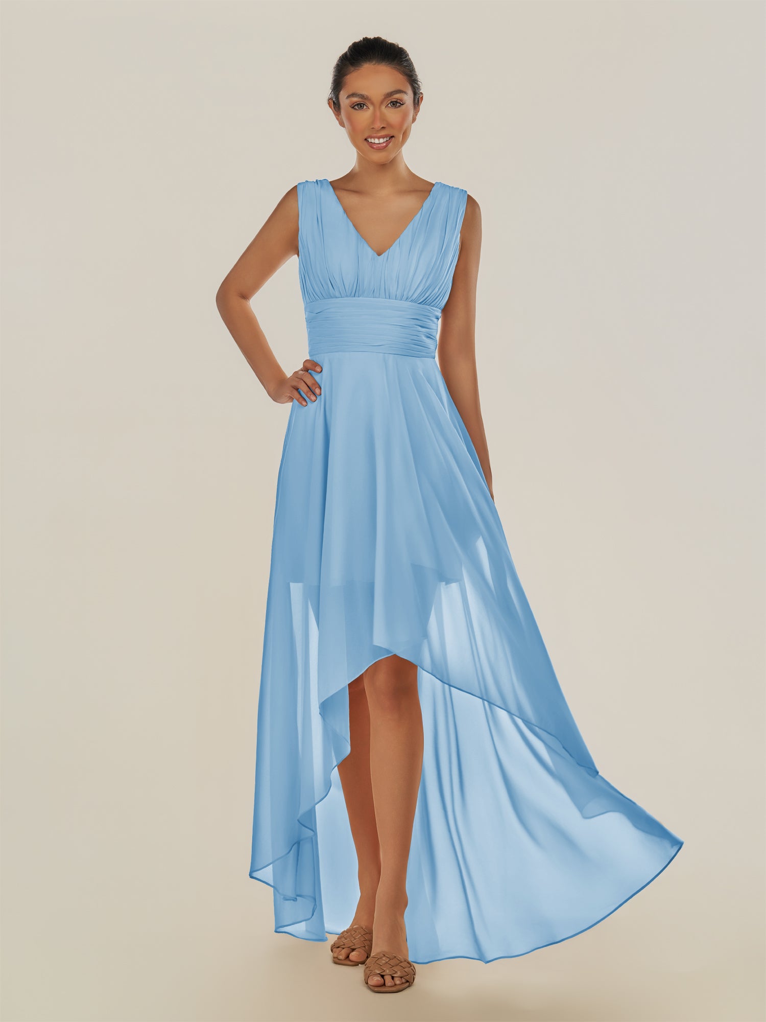 Jovi is a chic and modern choice for your bridal party. Crafted from soft chiffon, she features a flattering V-neckline and a sleeveless bodice for a timeless silhouette. Her high-low A-line skirt adds movement and visual interest, while delicate pleats enhance the elegant drape. Finished with a smooth zipper back, Jovi combines contemporary style with classic sophistication, perfect for weddings and special occasions.