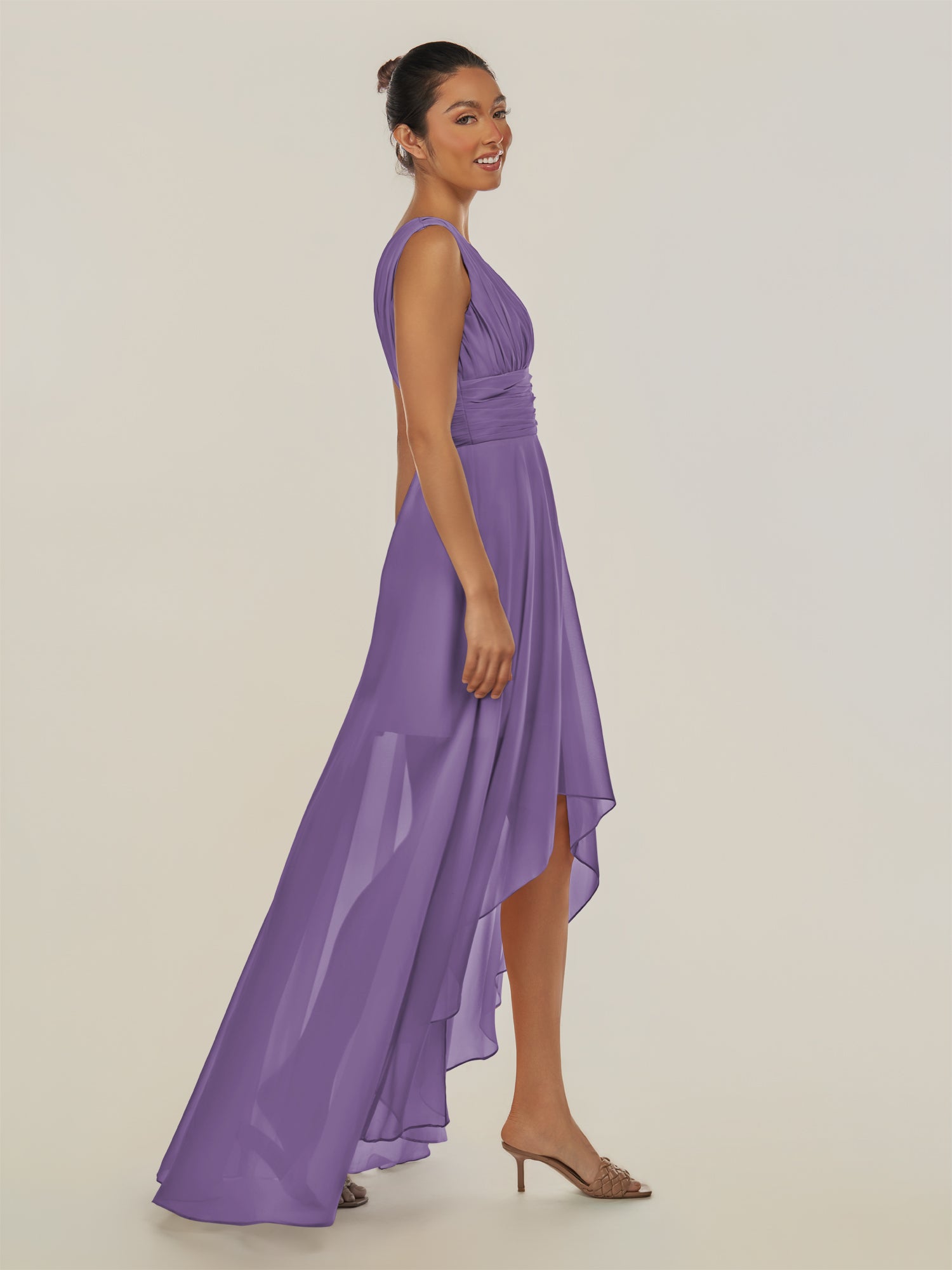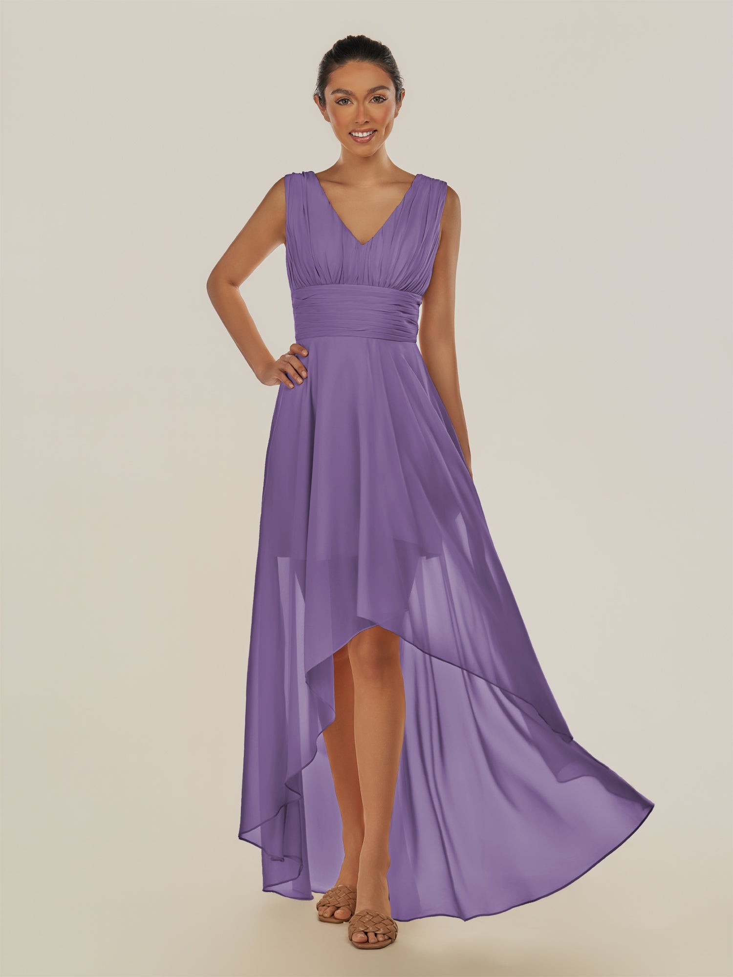 Jovi is a chic and modern choice for your bridal party. Crafted from soft chiffon, she features a flattering V-neckline and a sleeveless bodice for a timeless silhouette. Her high-low A-line skirt adds movement and visual interest, while delicate pleats enhance the elegant drape. Finished with a smooth zipper back, Jovi combines contemporary style with classic sophistication, perfect for weddings and special occasions.