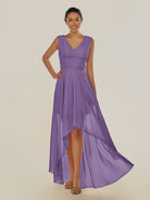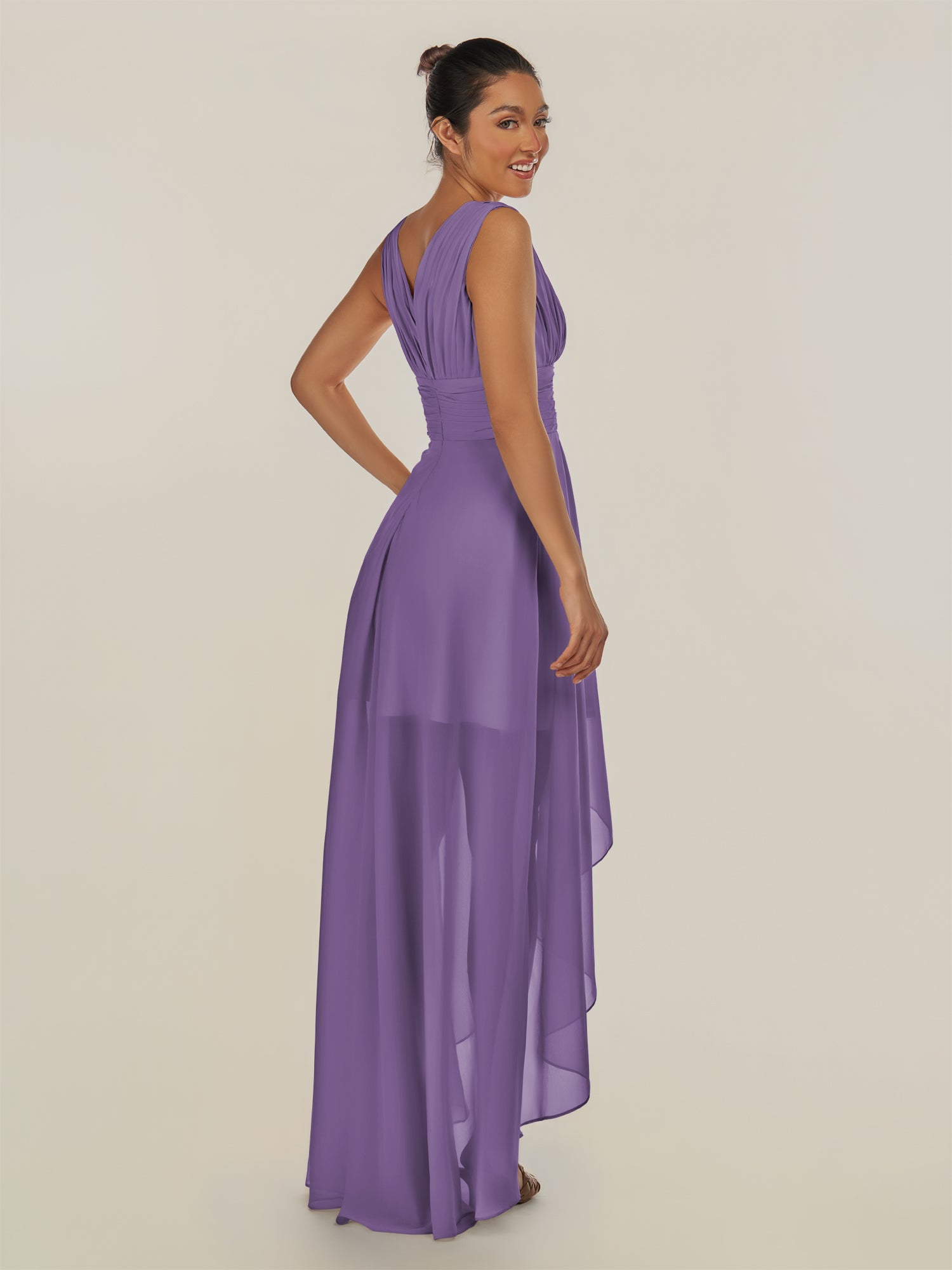 Jovi | Tahiti - A Line Chiffon V Neck High-low Length Pleated Long Bridesmaid Dress