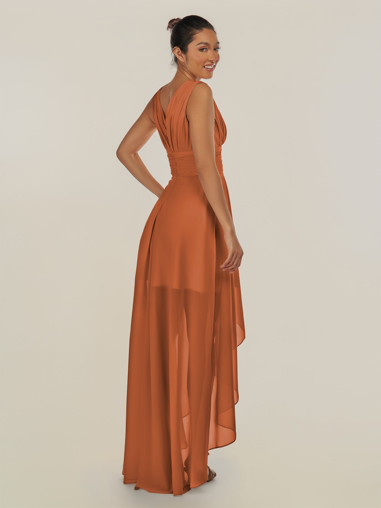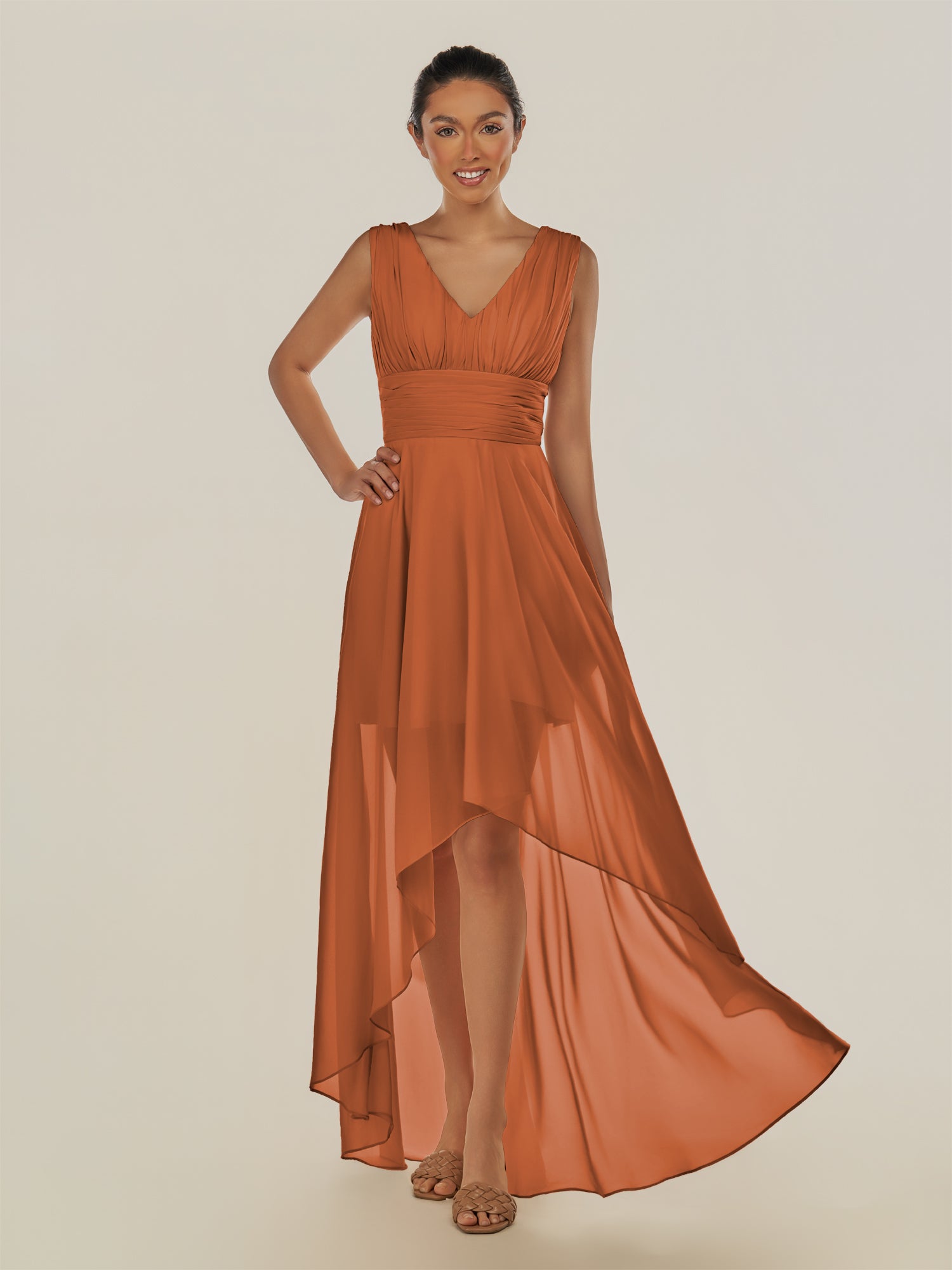 Jovi | Terracotta - A Line Chiffon V Neck High-low Length Pleated Long Bridesmaid Dress