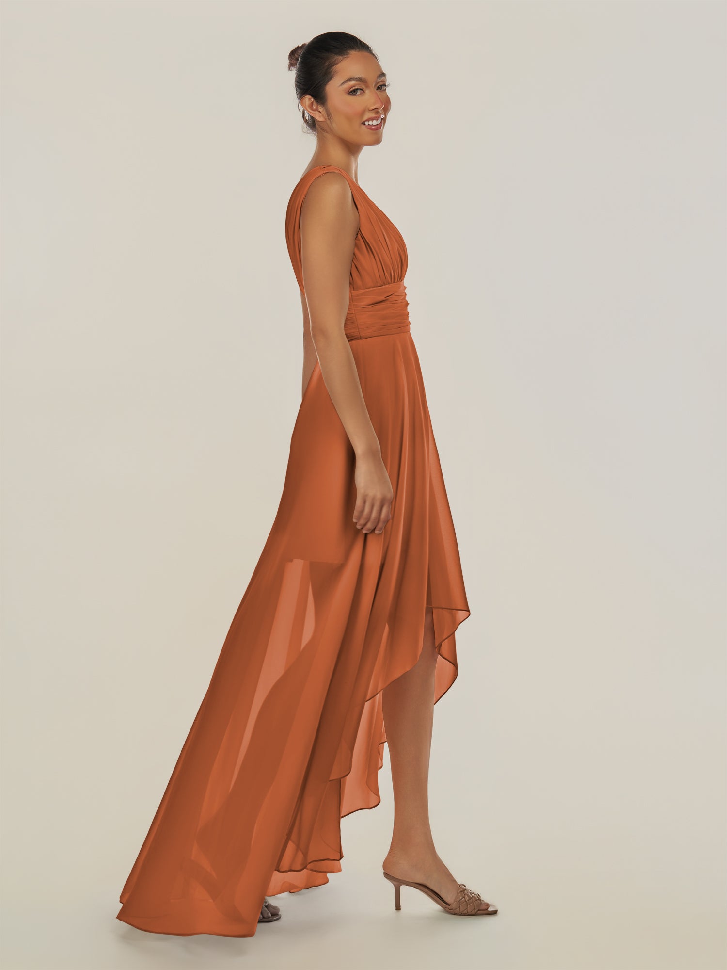 Jovi is a chic and modern choice for your bridal party. Crafted from soft chiffon, she features a flattering V-neckline and a sleeveless bodice for a timeless silhouette. Her high-low A-line skirt adds movement and visual interest, while delicate pleats enhance the elegant drape. Finished with a smooth zipper back, Jovi combines contemporary style with classic sophistication, perfect for weddings and special occasions.