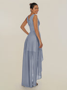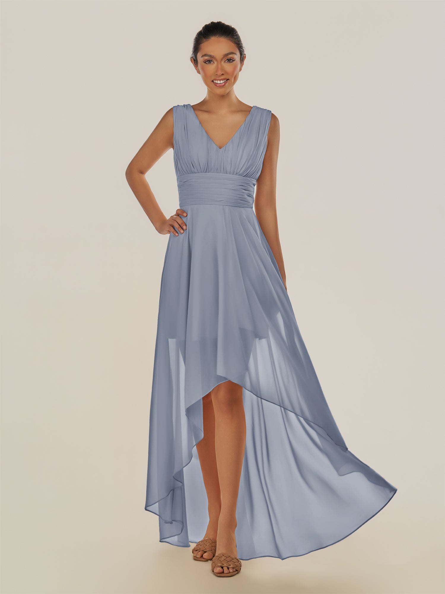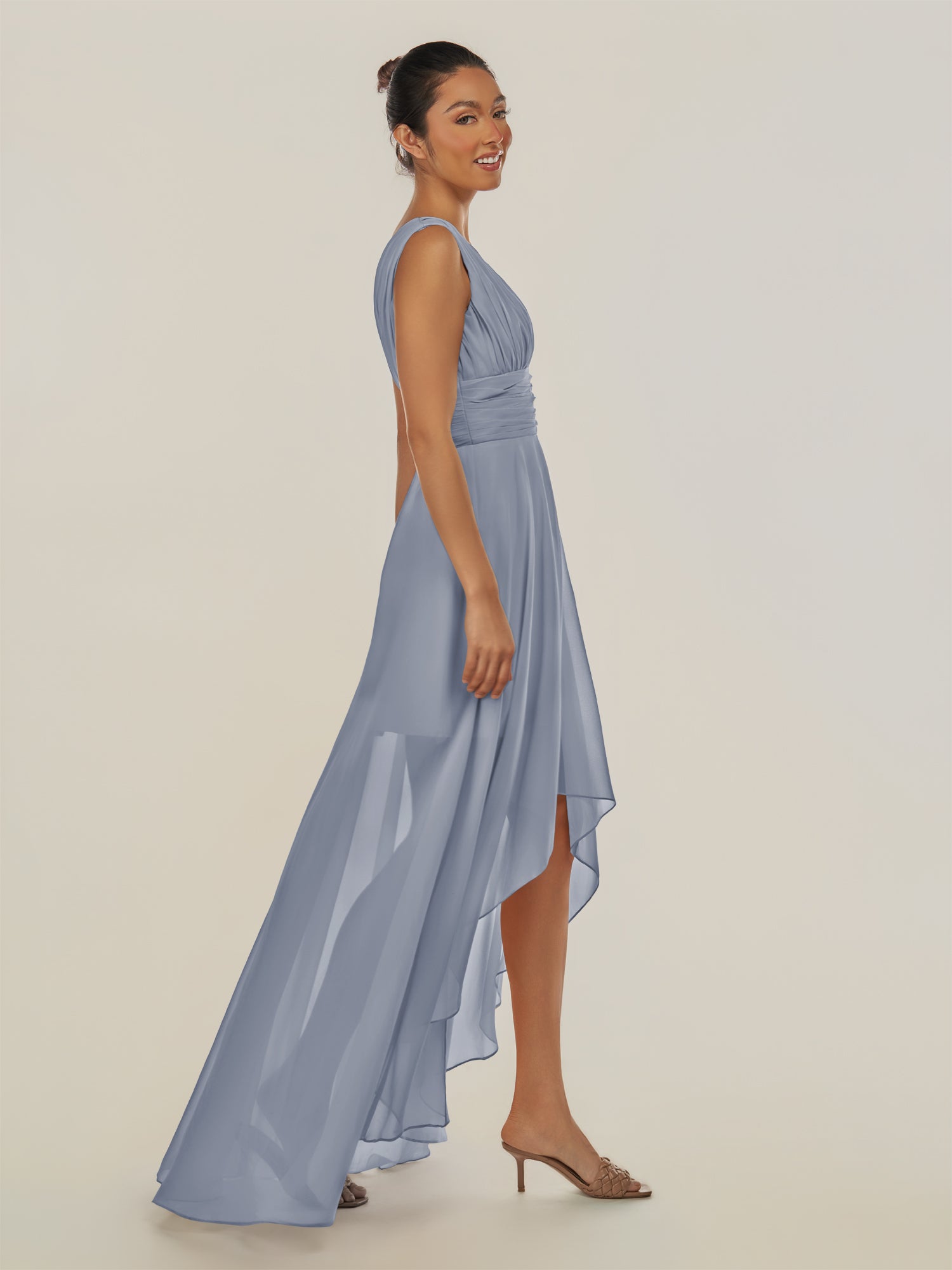 Jovi is a chic and modern choice for your bridal party. Crafted from soft chiffon, she features a flattering V-neckline and a sleeveless bodice for a timeless silhouette. Her high-low A-line skirt adds movement and visual interest, while delicate pleats enhance the elegant drape. Finished with a smooth zipper back, Jovi combines contemporary style with classic sophistication, perfect for weddings and special occasions.