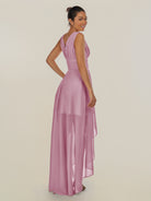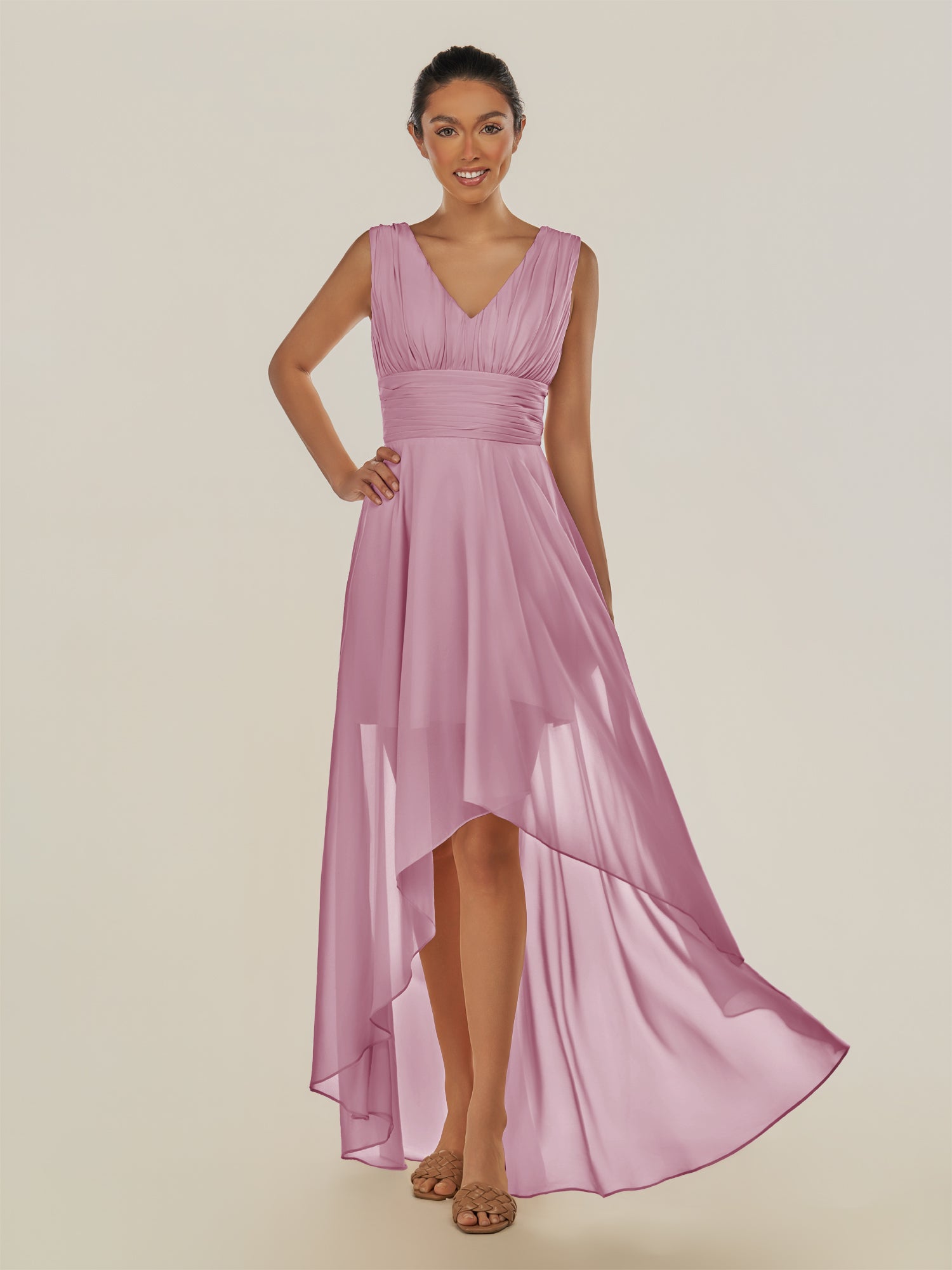 Jovi is a chic and modern choice for your bridal party. Crafted from soft chiffon, she features a flattering V-neckline and a sleeveless bodice for a timeless silhouette. Her high-low A-line skirt adds movement and visual interest, while delicate pleats enhance the elegant drape. Finished with a smooth zipper back, Jovi combines contemporary style with classic sophistication, perfect for weddings and special occasions.