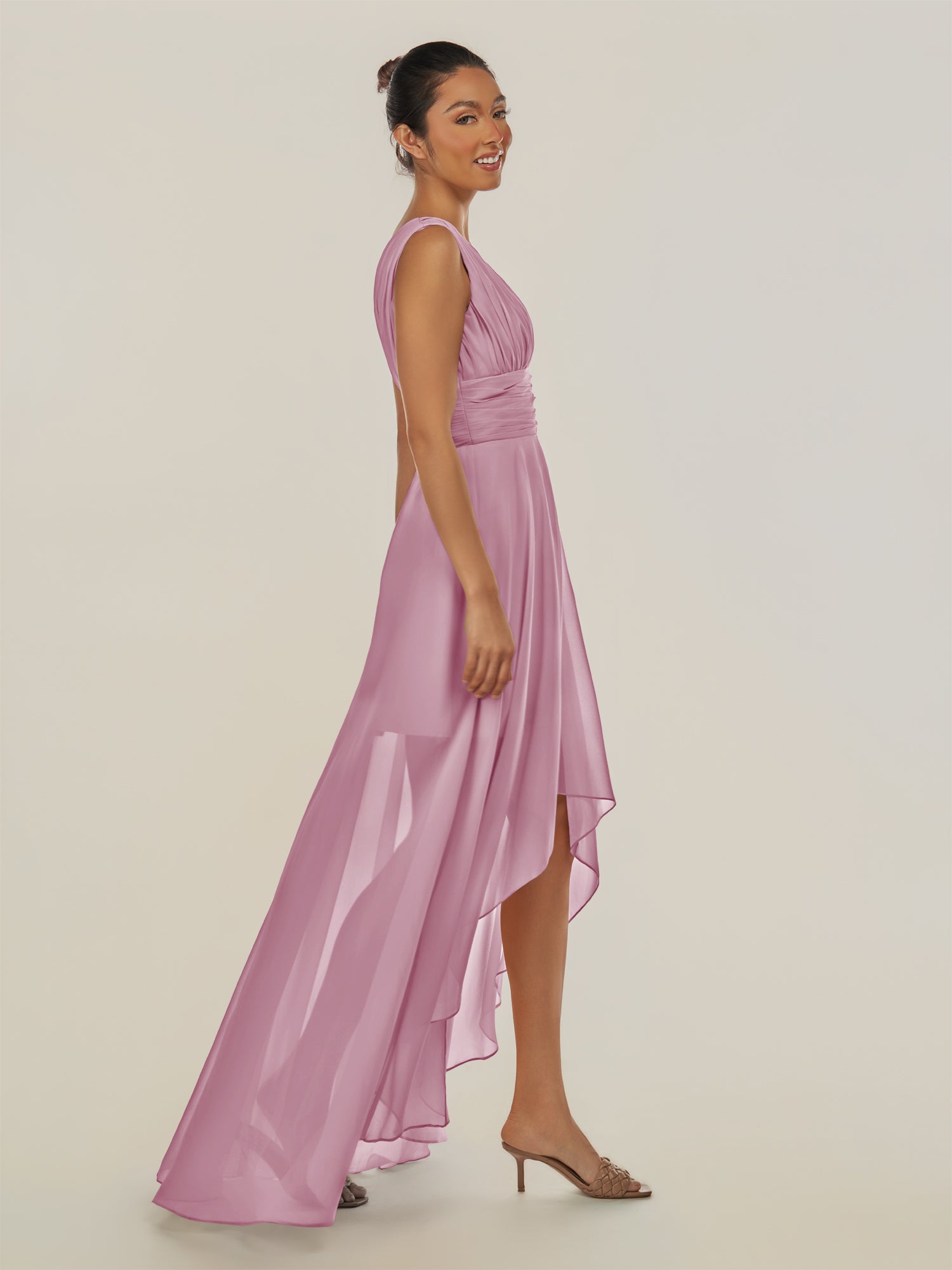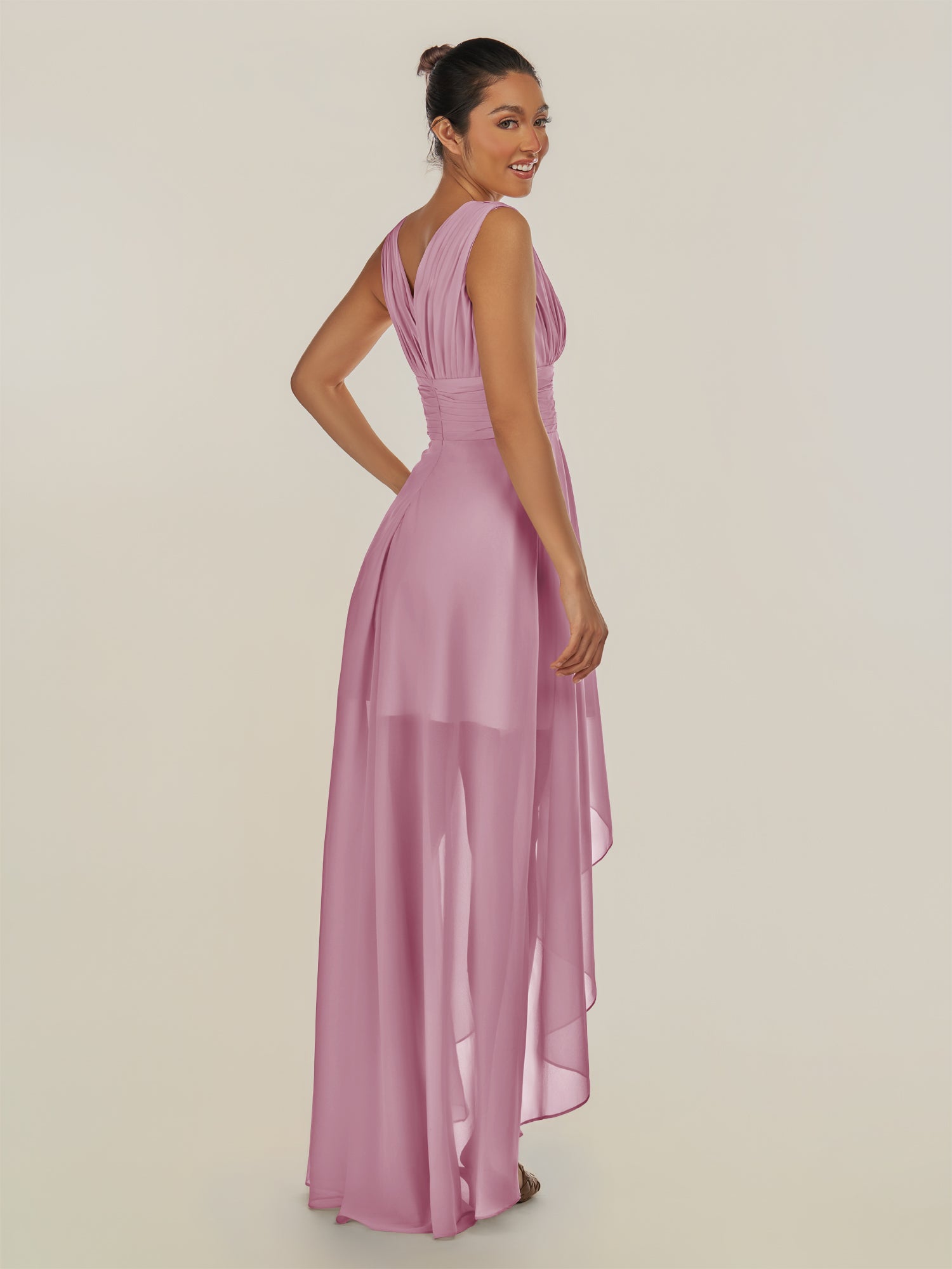 Jovi | Vintage Mauve - A Line Chiffon V Neck High-low Length Pleated Long Bridesmaid Dress