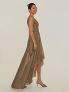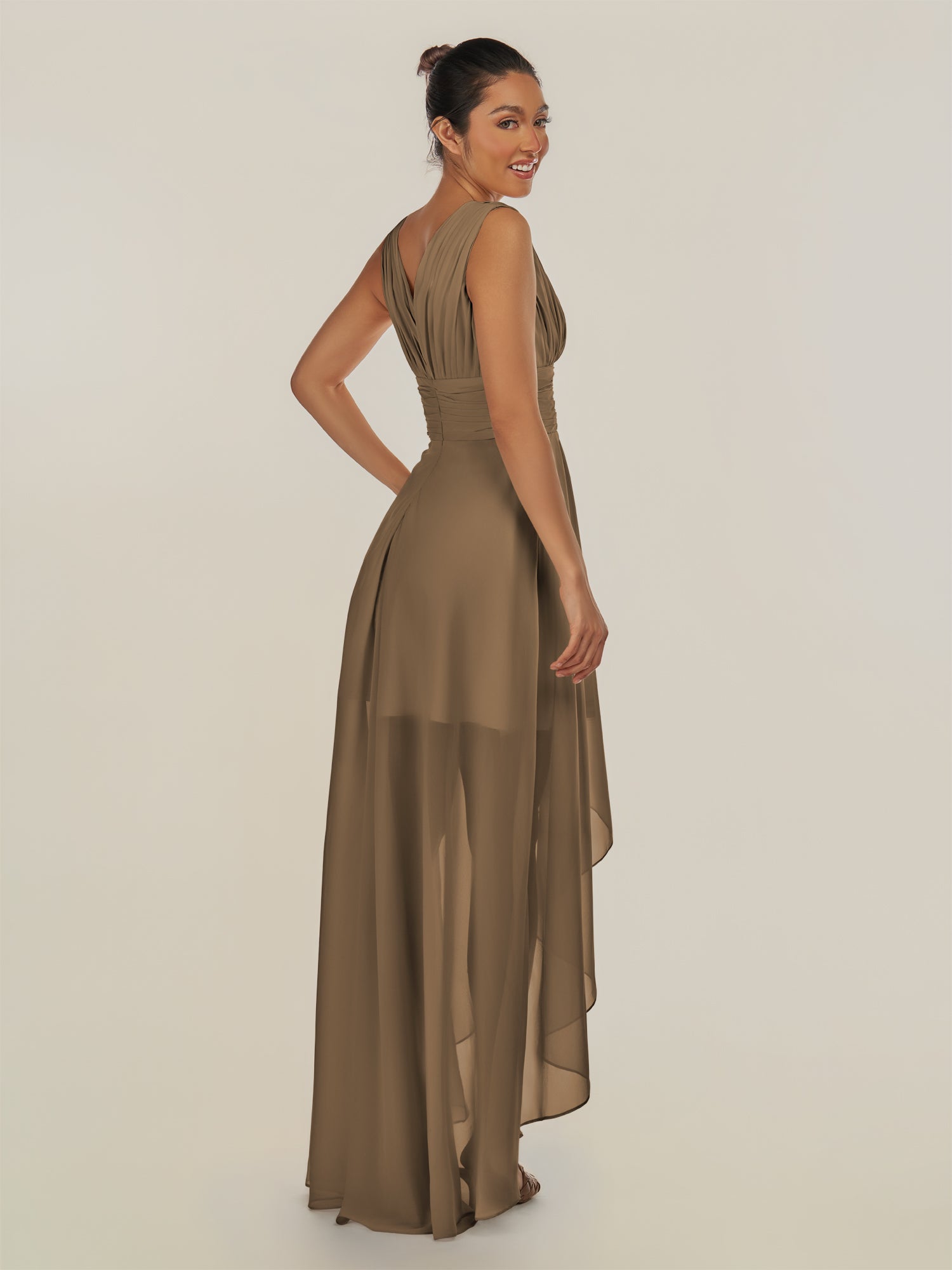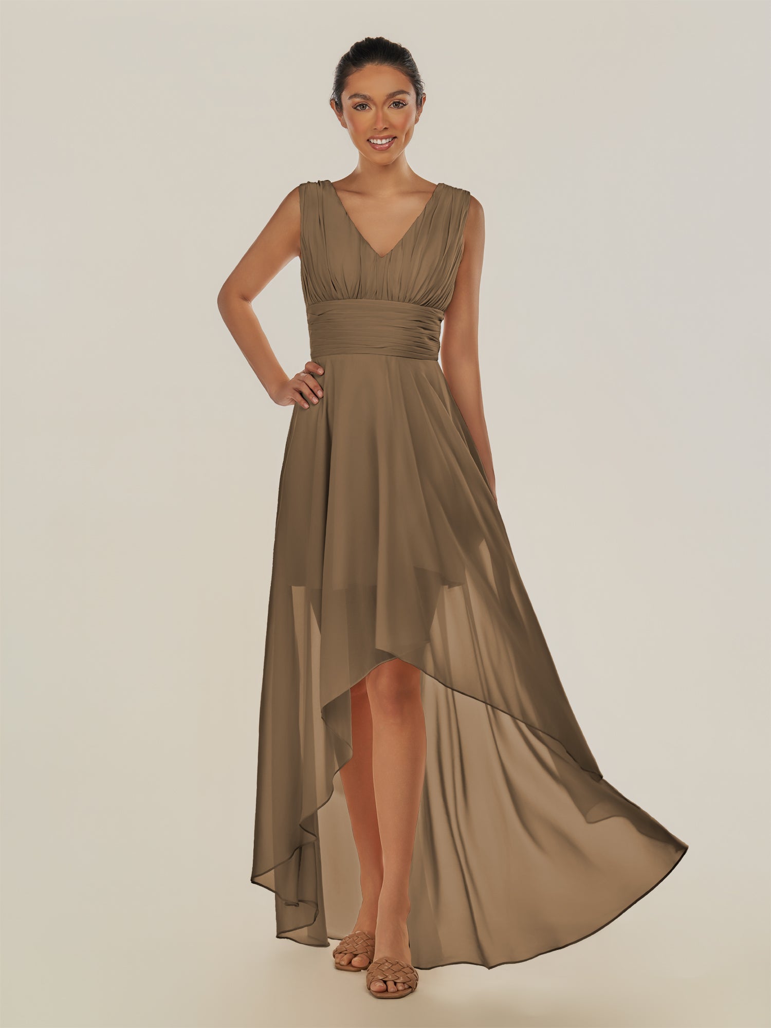 Jovi is a chic and modern choice for your bridal party. Crafted from soft chiffon, she features a flattering V-neckline and a sleeveless bodice for a timeless silhouette. Her high-low A-line skirt adds movement and visual interest, while delicate pleats enhance the elegant drape. Finished with a smooth zipper back, Jovi combines contemporary style with classic sophistication, perfect for weddings and special occasions.