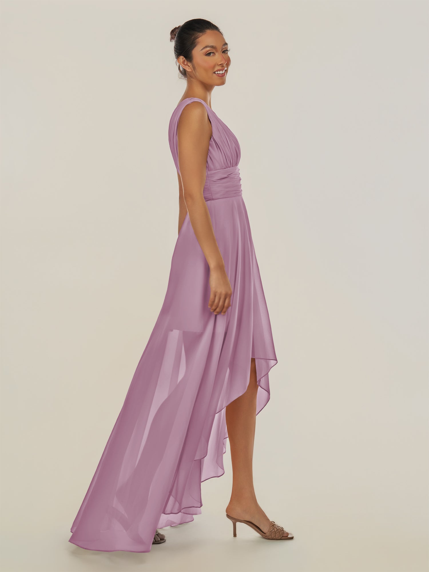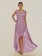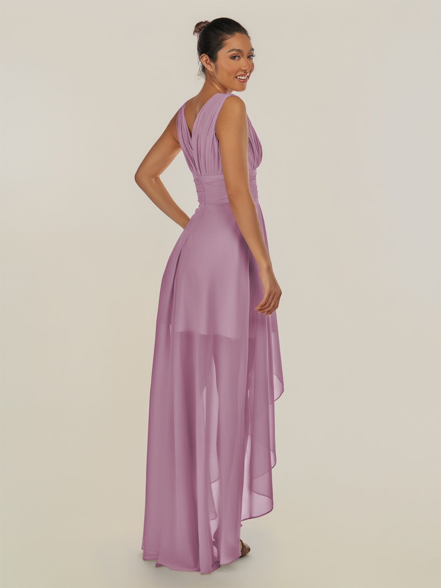 Jovi | Wisteria - A Line Chiffon V Neck High-low Length Pleated Long Bridesmaid Dress
