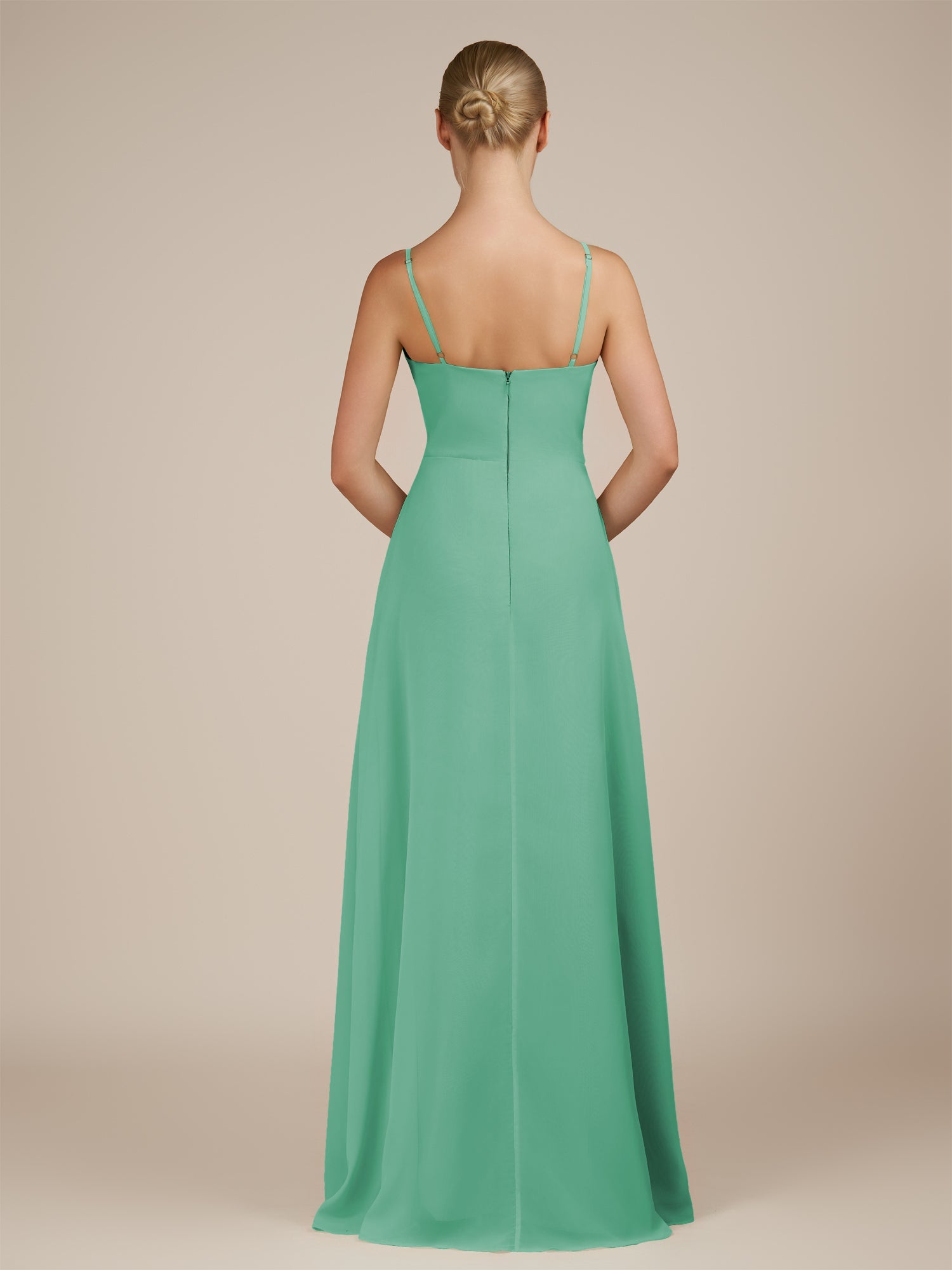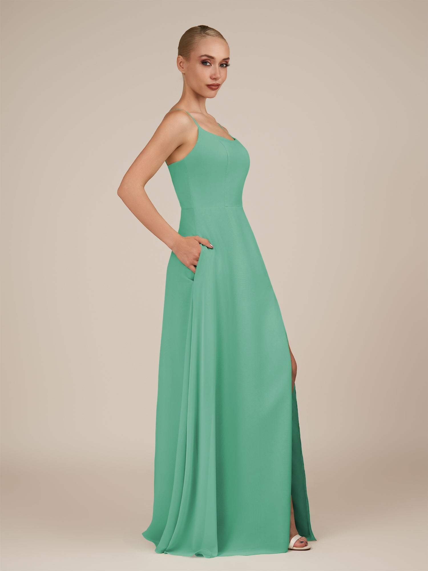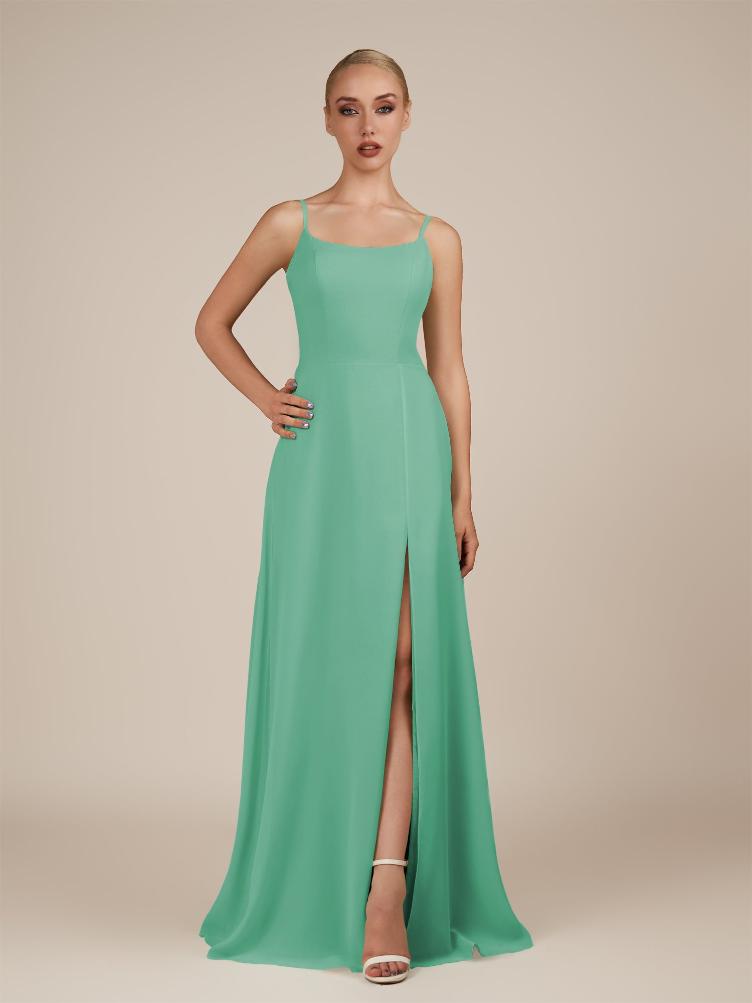 Jovienne is a sleek and sophisticated choice for your bridesmaids. Crafted from soft chiffon, she features a classic scoop neckline and a delicately pleated bodice that flatters the figure. Her floor-length sheath skirt flows gracefully with every step, enhanced by a subtle leg slit for ease and elegance. Finished with a smooth zipper back, Jovienne blends modern style with timeless charm for weddings and special celebrations.