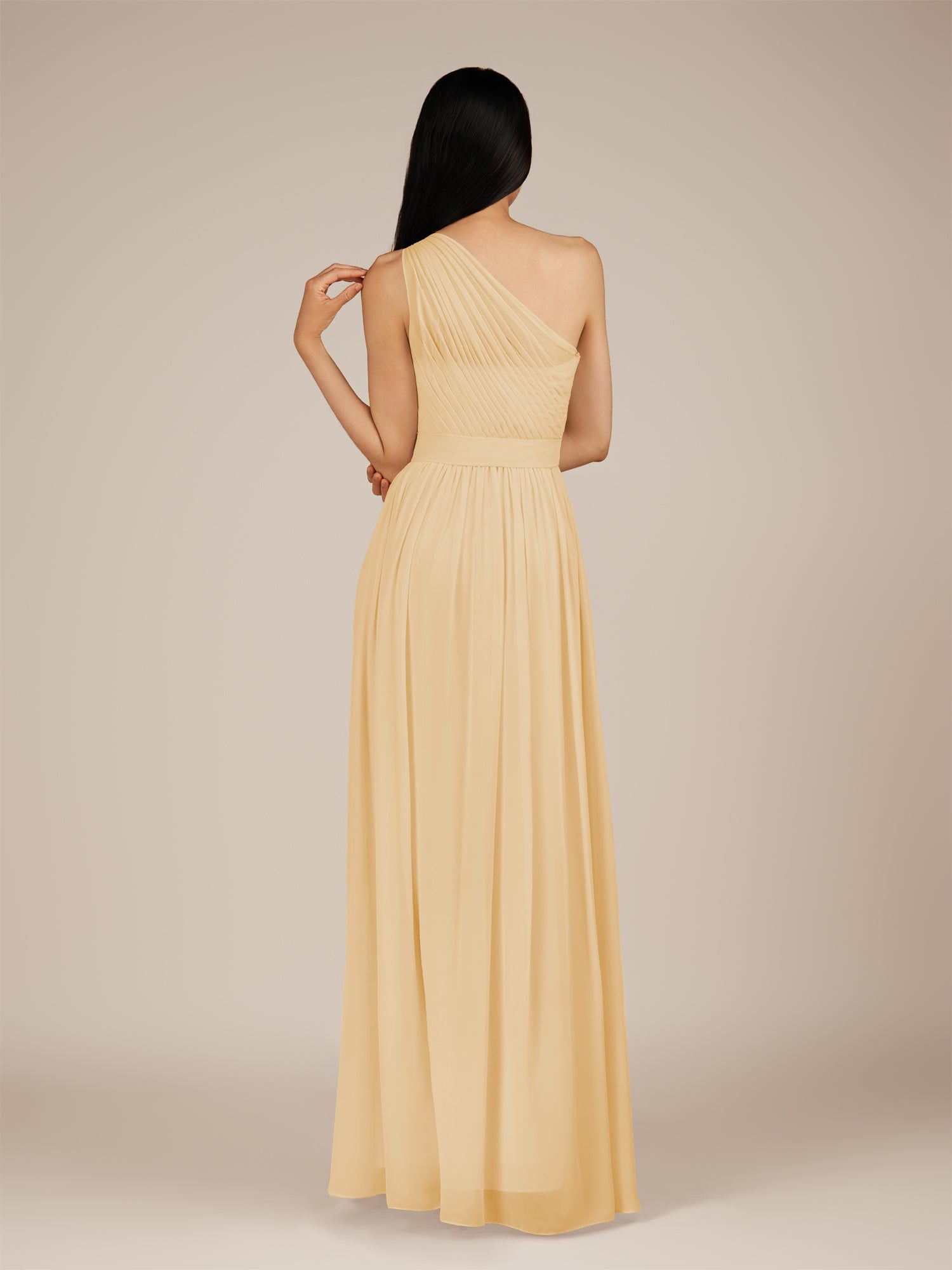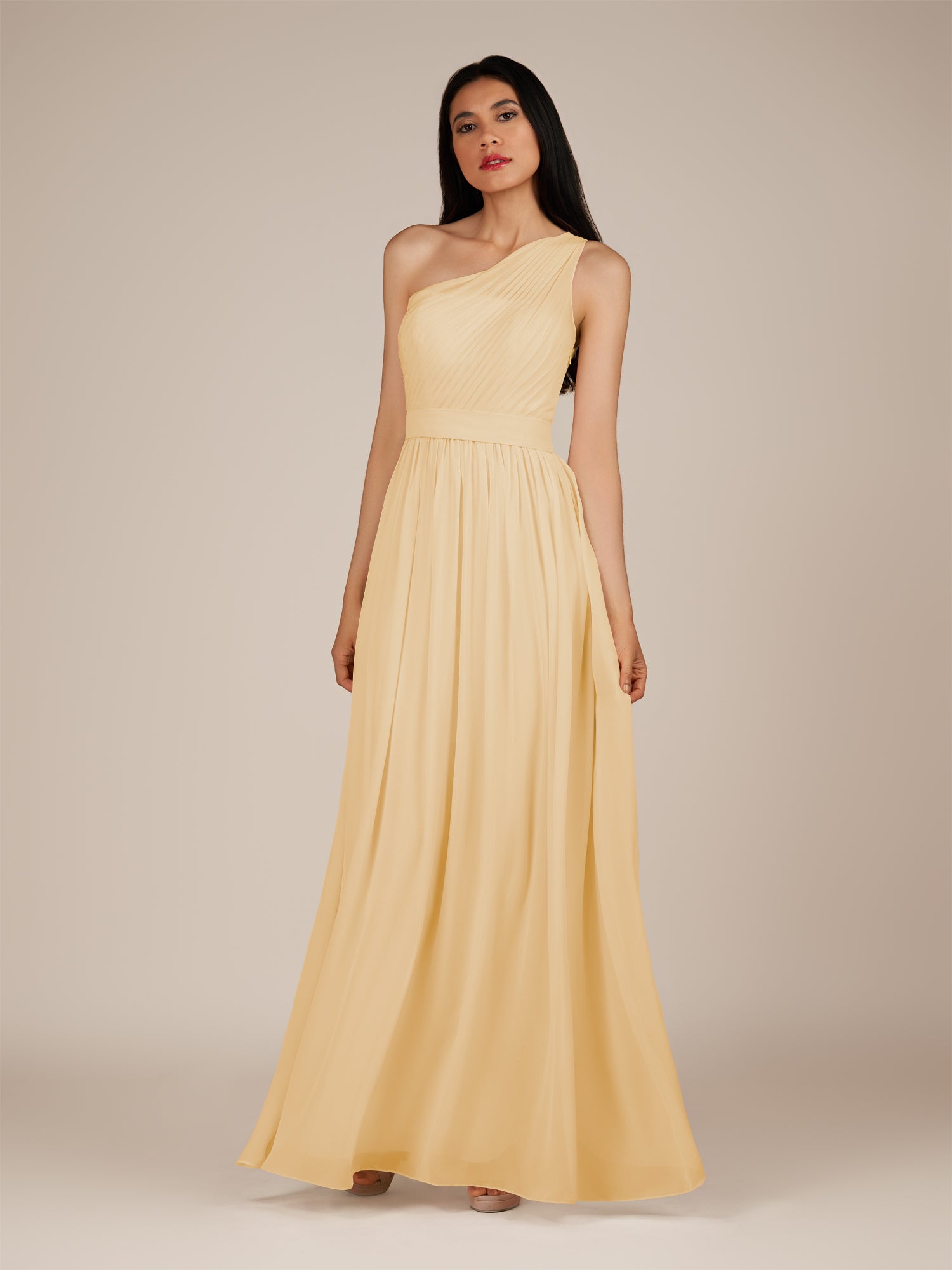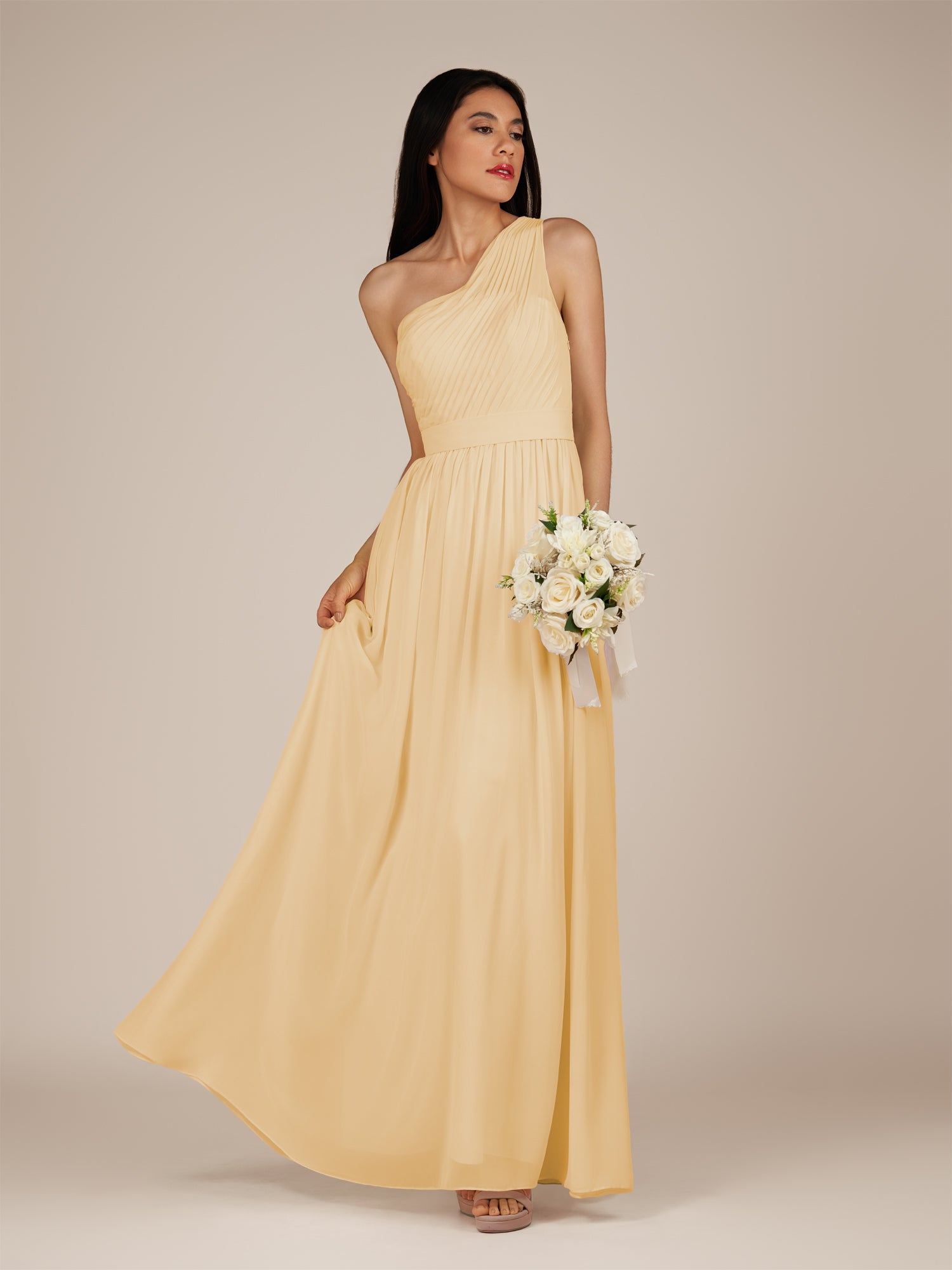 Juliet | Golden Champagne - A Line Chiffon One Shoulder Pleated Long Bridesmaid Dress