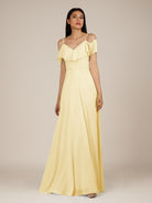 Junessa | Pastel Yellow - A Line Off the Shoulder Chiffon Long Bridesmaid Dress with Ruffles