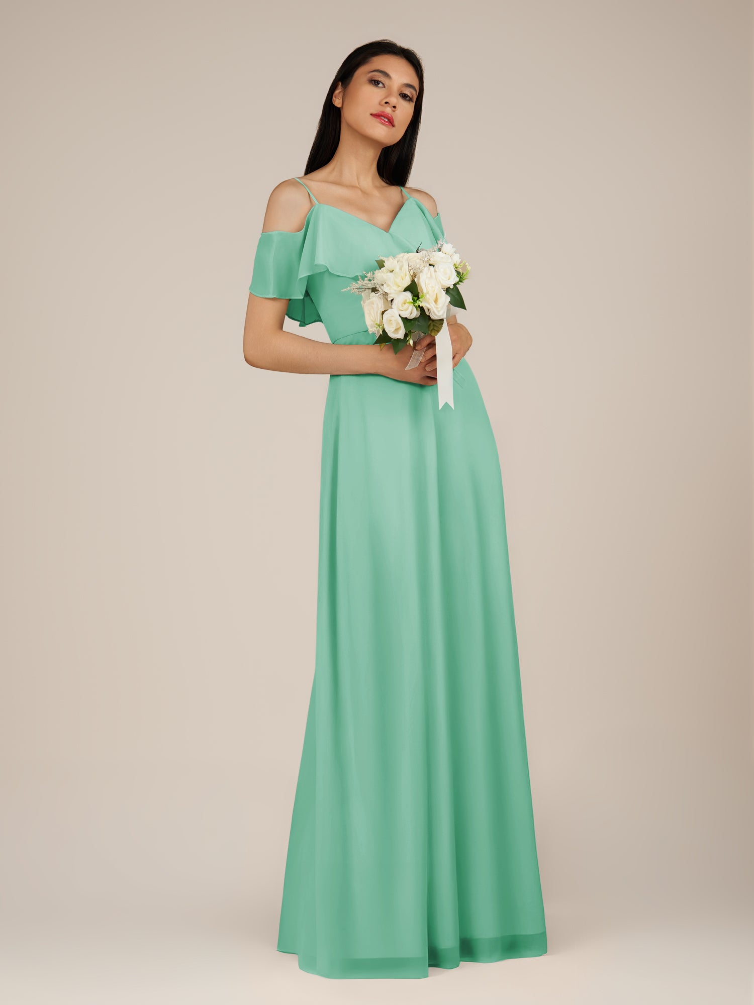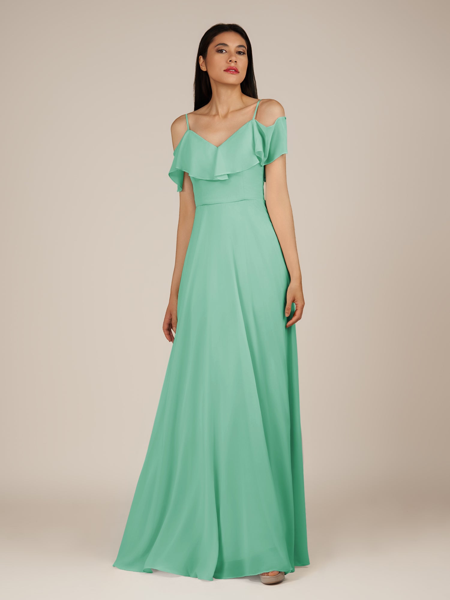 Junessa is a romantic and graceful choice for your bridal party. Crafted from soft chiffon, she features an off-the-shoulder neckline and a sleeveless bodice for a timeless, airy look. Her floor-length A-line skirt flows effortlessly with every step, enhanced by delicate ruffle details that add movement and charm. Finished with a smooth zipper back, Junessa combines elegance and modern style, perfect for weddings and special celebrations.