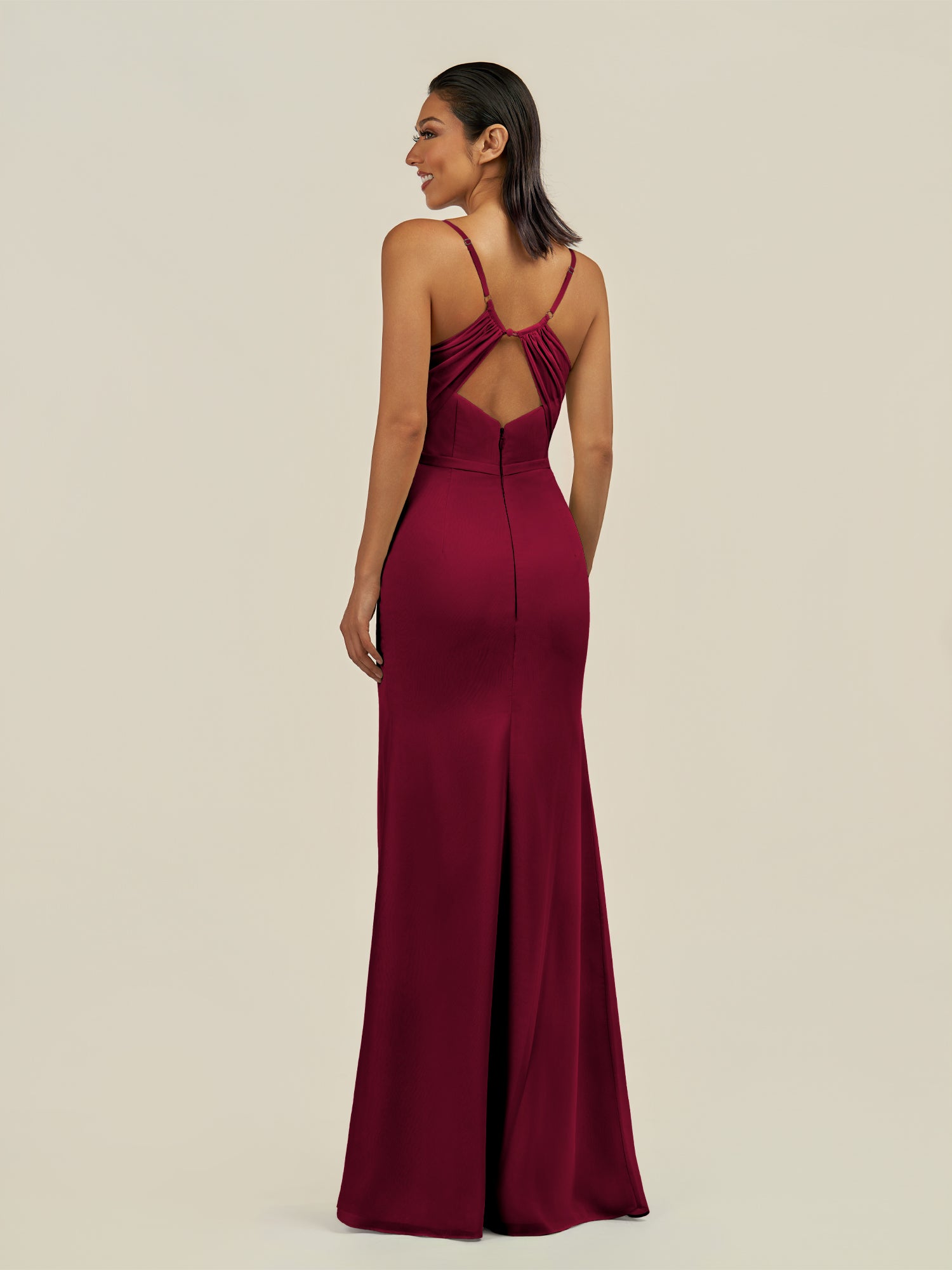 Kaelin is a sleek and elegant choice for your bridal party. Crafted from soft chiffon, she features a flattering V-neckline and a sleeveless bodice that highlights the shoulders with grace. Her floor-length sheath silhouette flows smoothly, enhanced by a subtle side slit for movement and modern sophistication. Finished with a smooth zipper back, Kaelin blends timeless style with contemporary elegance—perfect for weddings and special occasions.