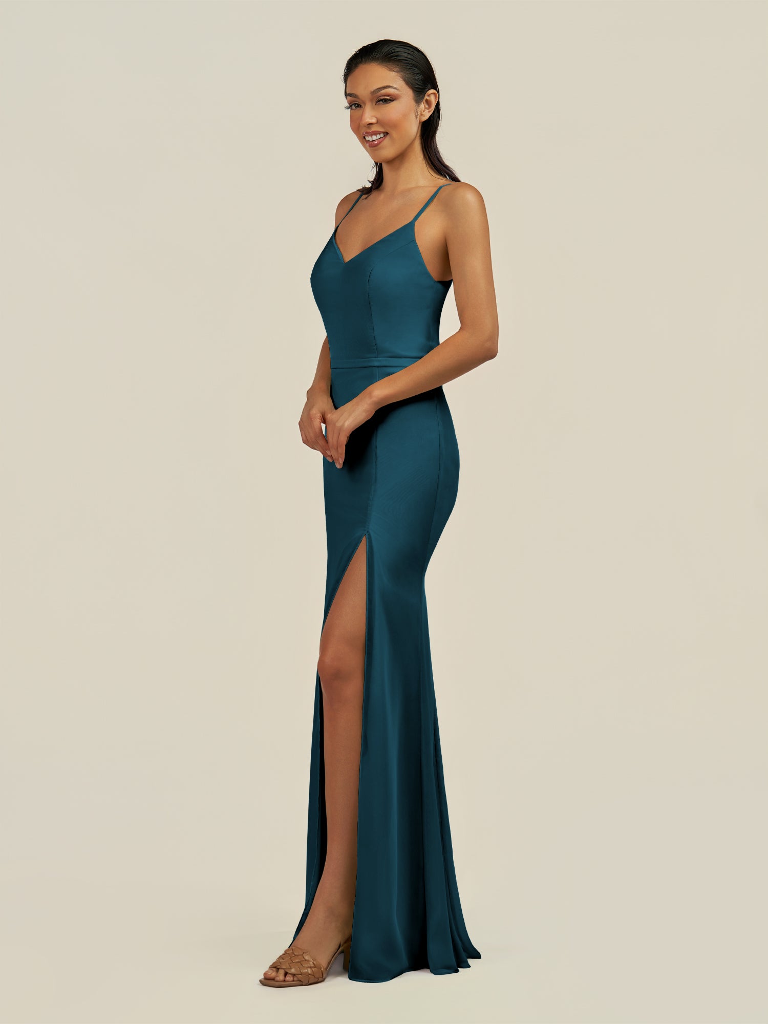 Kaelin is a sleek and elegant choice for your bridal party. Crafted from soft chiffon, she features a flattering V-neckline and a sleeveless bodice that highlights the shoulders with grace. Her floor-length sheath silhouette flows smoothly, enhanced by a subtle side slit for movement and modern sophistication. Finished with a smooth zipper back, Kaelin blends timeless style with contemporary elegance—perfect for weddings and special occasions.