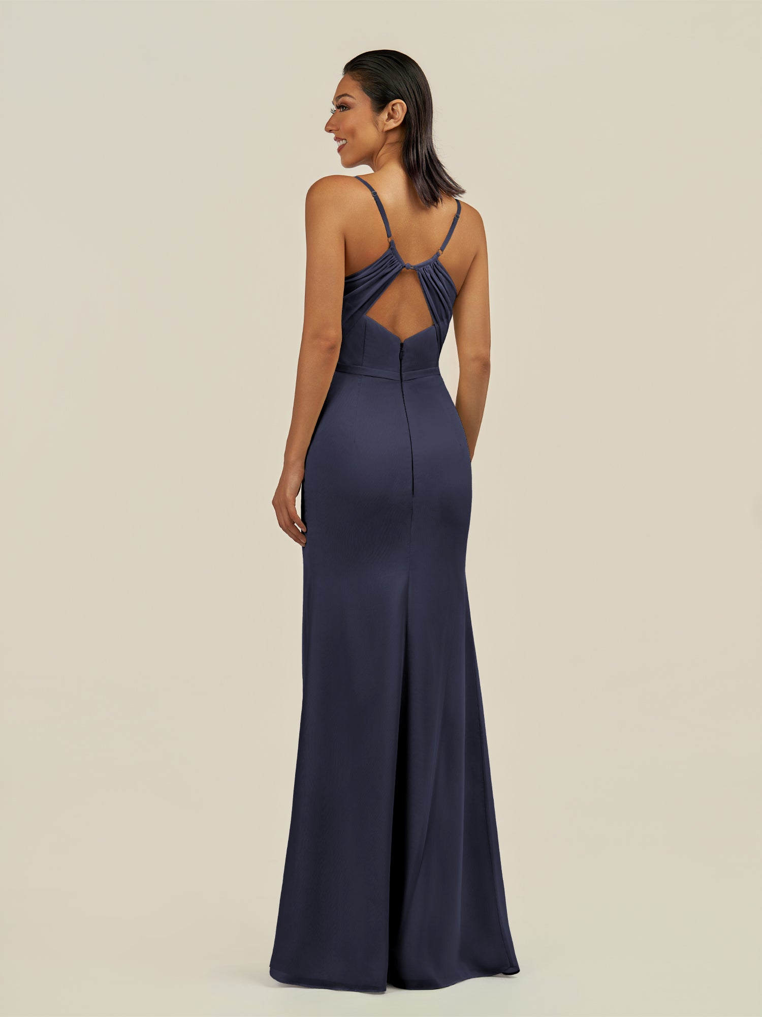 Kaelin is a sleek and elegant choice for your bridal party. Crafted from soft chiffon, she features a flattering V-neckline and a sleeveless bodice that highlights the shoulders with grace. Her floor-length sheath silhouette flows smoothly, enhanced by a subtle side slit for movement and modern sophistication. Finished with a smooth zipper back, Kaelin blends timeless style with contemporary elegance—perfect for weddings and special occasions.