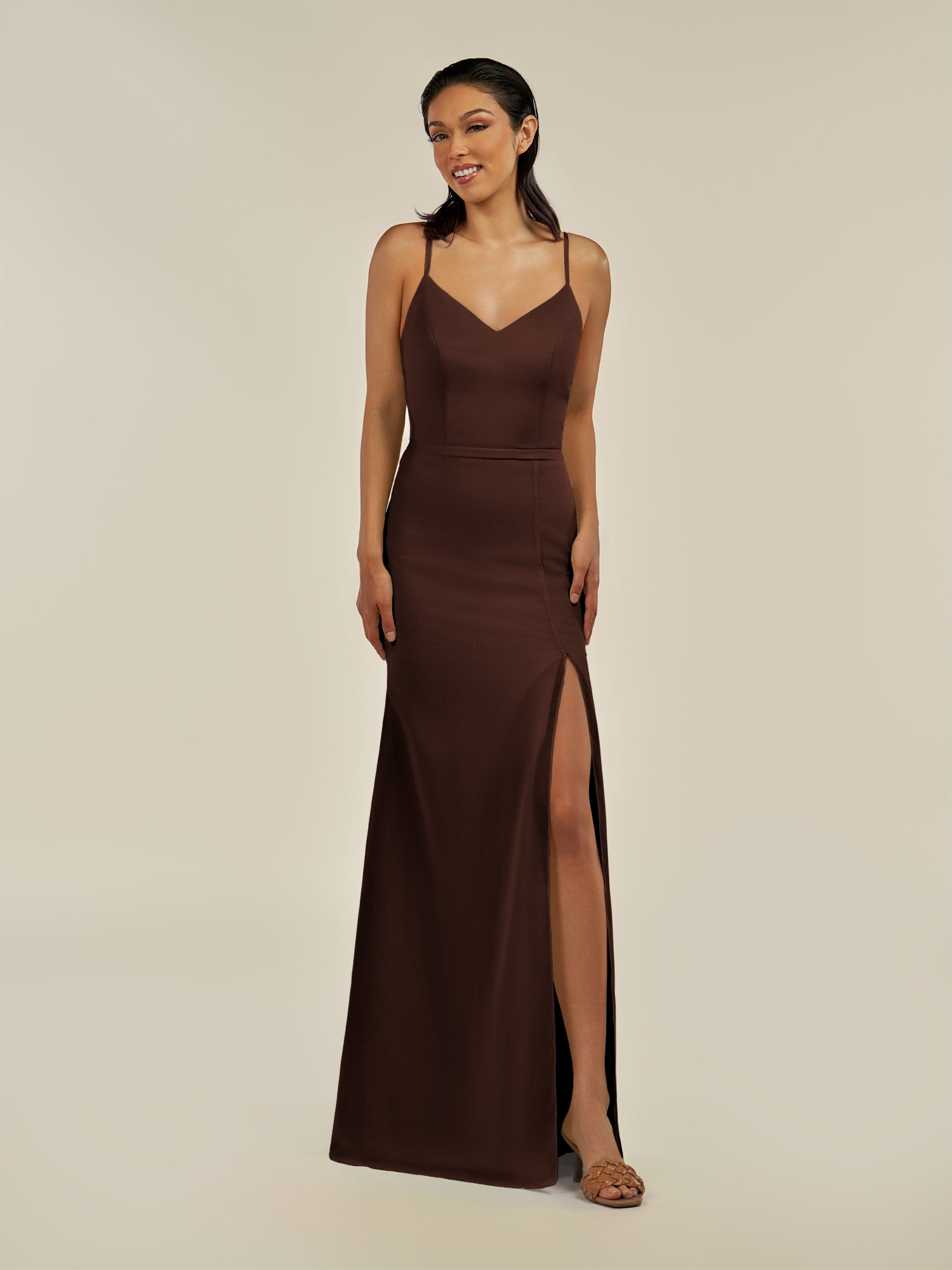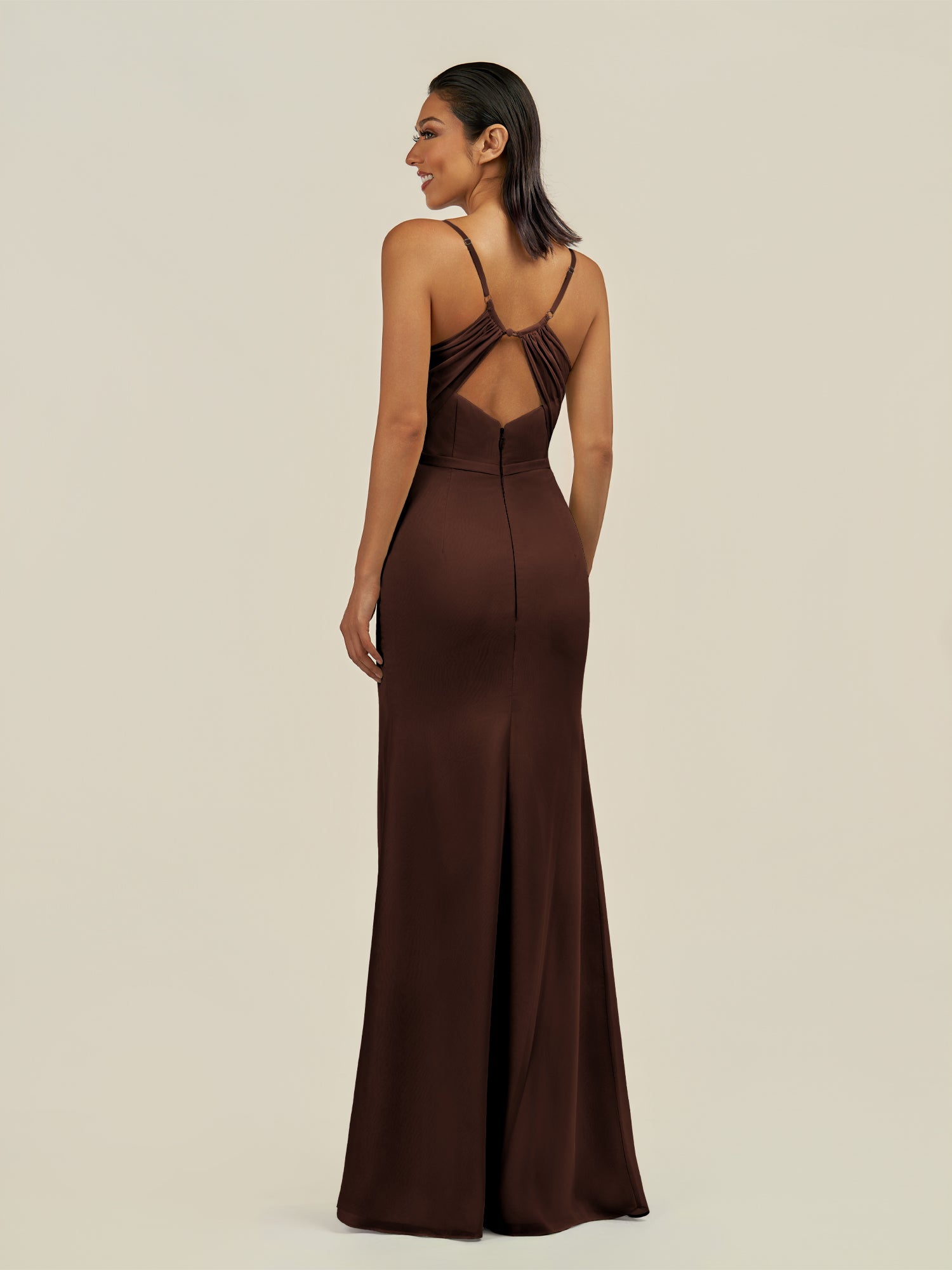 Kaelin is a sleek and elegant choice for your bridal party. Crafted from soft chiffon, she features a flattering V-neckline and a sleeveless bodice that highlights the shoulders with grace. Her floor-length sheath silhouette flows smoothly, enhanced by a subtle side slit for movement and modern sophistication. Finished with a smooth zipper back, Kaelin blends timeless style with contemporary elegance—perfect for weddings and special occasions.